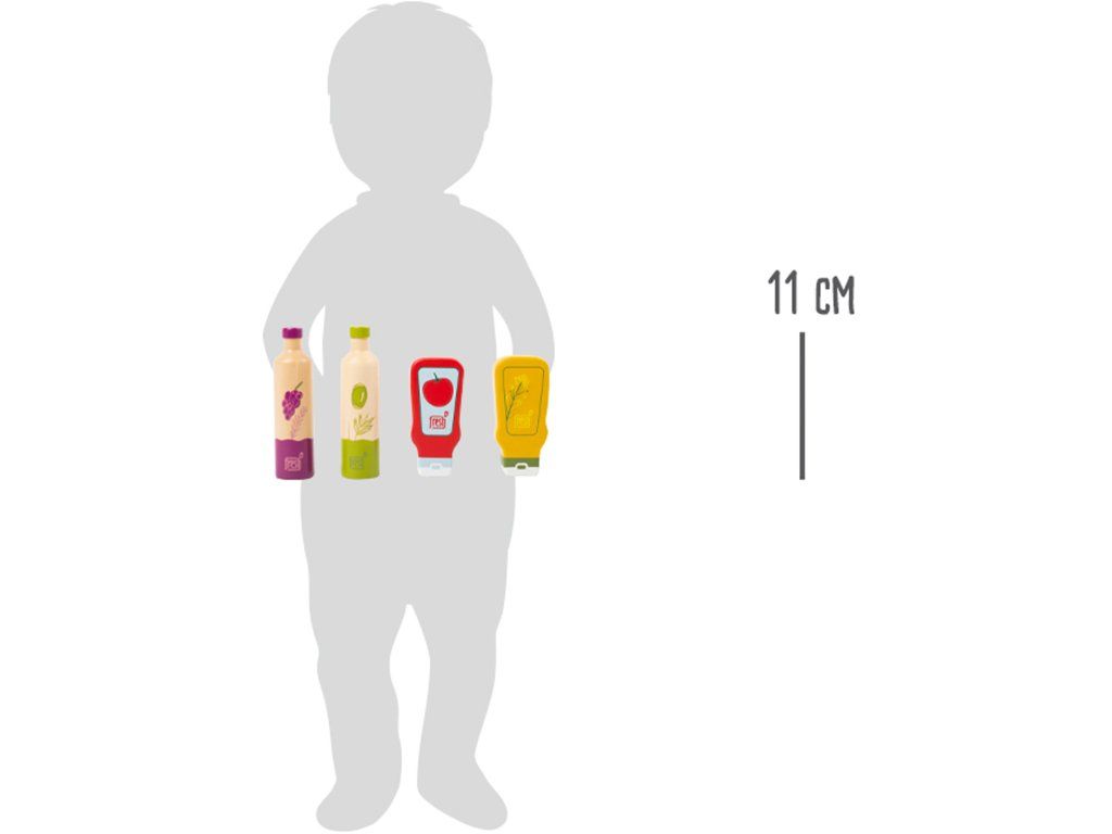 To správné koření do dětské kuchyňky! Herní set obsahuje lahvičky z kvalitního dřeva v typických barvách daného produktu. Díky výrazným ilustracím na lahvi dítě jejich obsah snadno rozpozná. Set obsahuje ocet, olej, kečup a hořčici. Hlavní vlastnosti: sada obsahuje 4kspodporuje představivost a hraní rolíDoplňkové parametry
