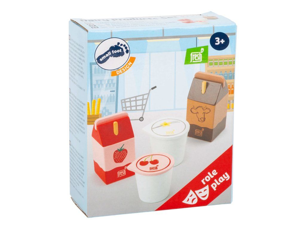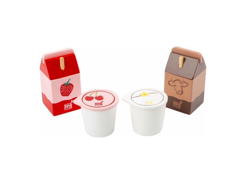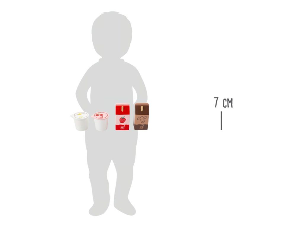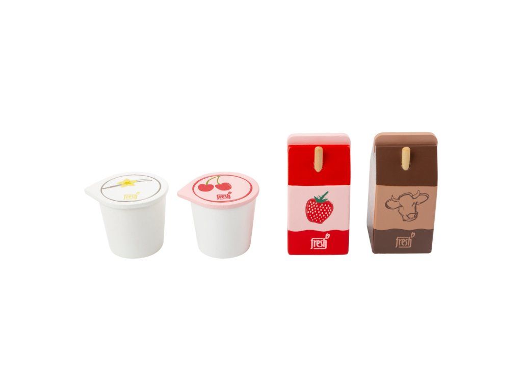 Z lednice rovnou do nákupního košíku. Tyto čtyři dřevěné mléčné produkty jsou ideálním doplňkem dětských kuchyněk nebo prodejních stánků. Kromě jahodového je zde i kakaové mléko, obě s brčkem. Sada dále obsahuje maketu vanilkového a třešňového jogurtu. Realistická hračka, která se dětem bude určitě líbit. Pevné dřevo zaručuje dlouhotrvající kvalitu. Hlavní vlastnosti: sada obsahuje 4 kshračka podporuje hraní rolíDoplňkové parametry