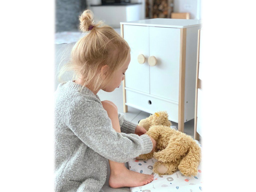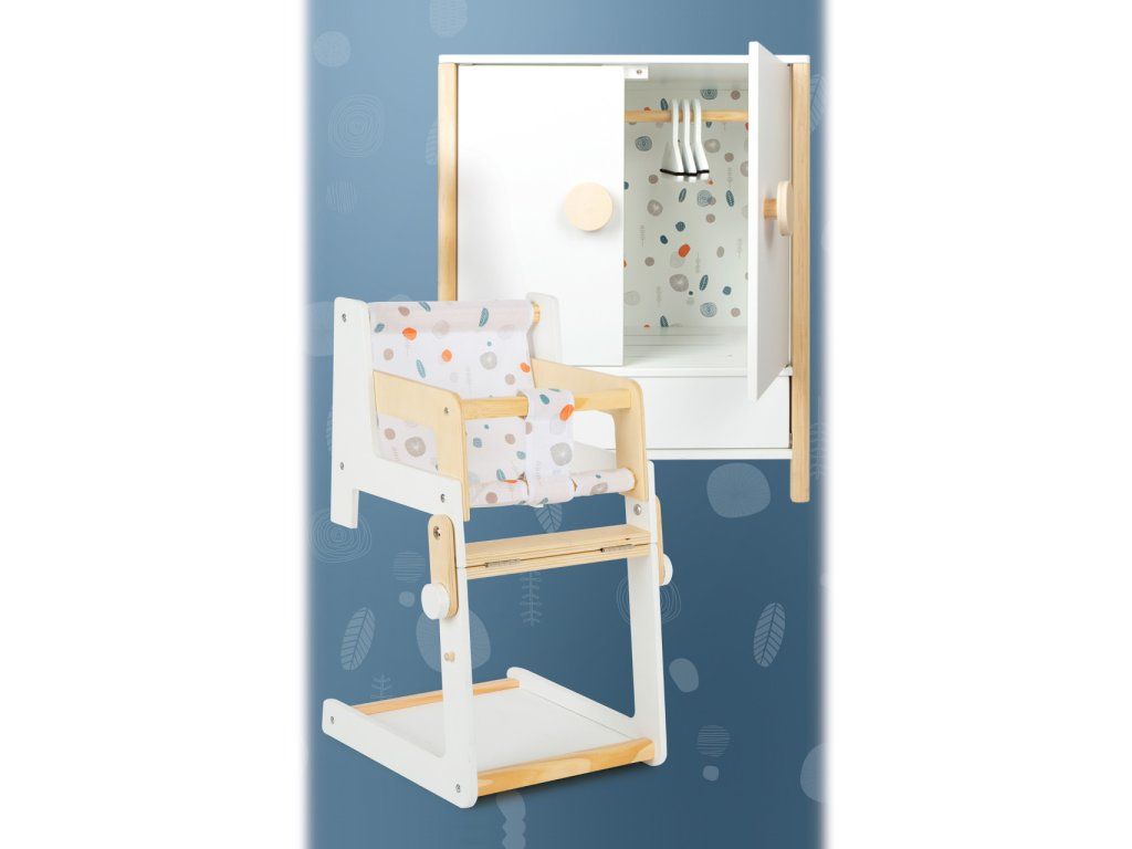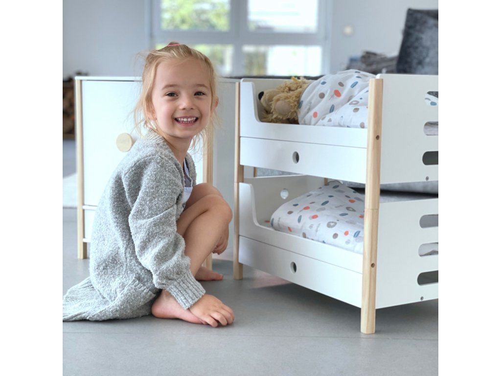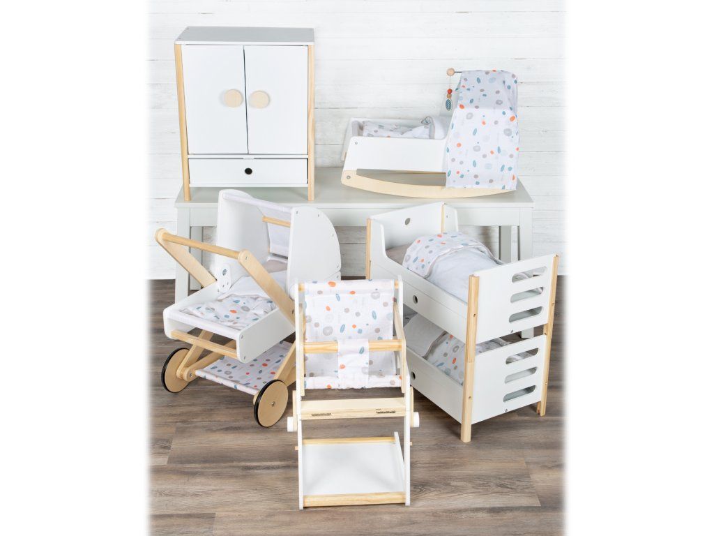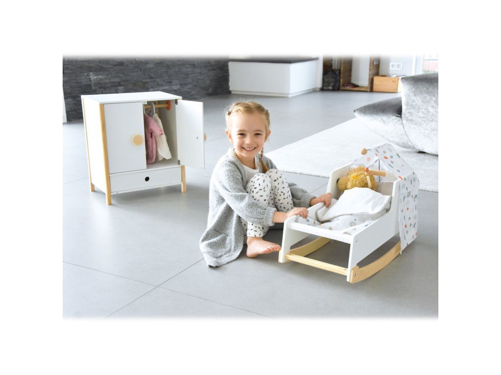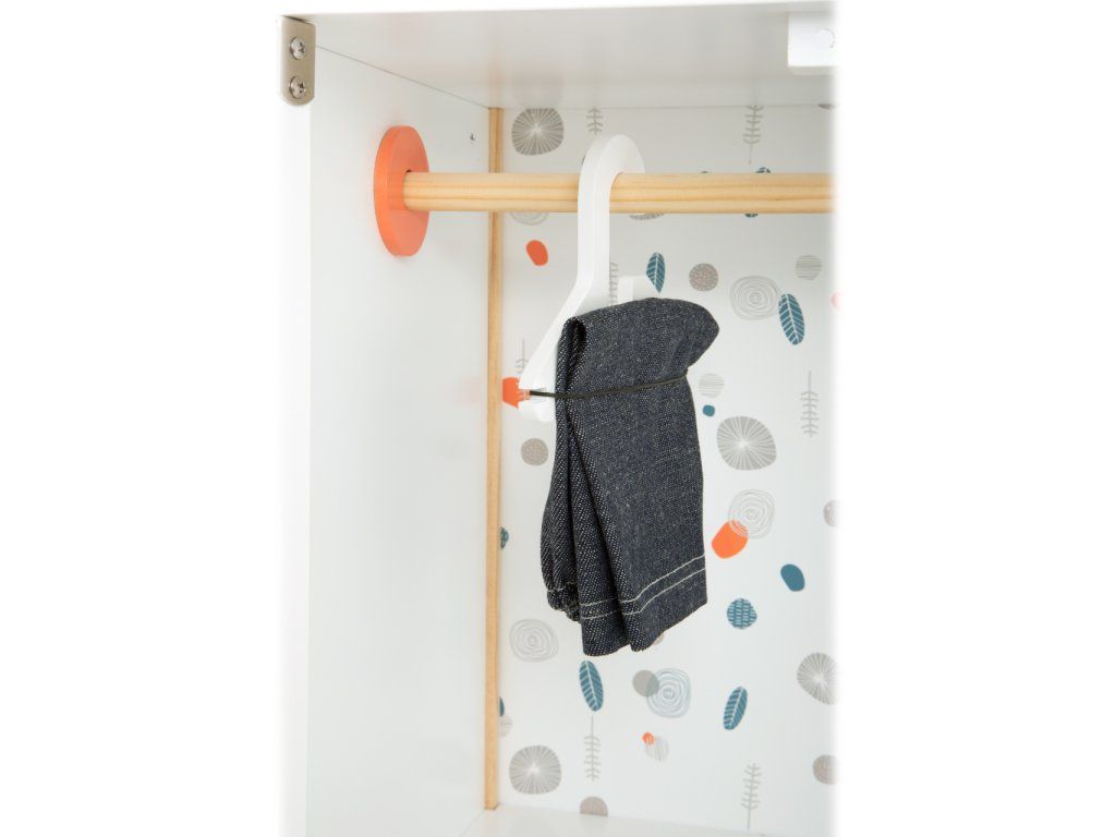 Všechno oblečení pro panenky po ruce. Prostorná dřevěná skříň udělá dojem na každého z vás nejen díky svým jednoduše otevíratelným dveřím. Jednoduchý skandinávský design, uvnitř jemné barevné tóny. Po otevření skříně najdete na šatní tyči ramínka, také oddělitelné poličky a šuplík. Můžete tak všechno oblečení uložit dle vlastního gusta, můžete také použít vlastní ramínka. Díky této hračce se děti naučí důležitosti úklidu a také jak se dobře starat o vlastní oblečení, aby nám vydrželo co nejdéle. Hlavní vlastnosti Prostorná dřevěná skříňJednoduše otevíratelné dveřeŠatní tyč, ramínka, šuplíkZaoblené hrany, viditelně dřevěnáGenderově neutrální barvaSkandinávský lineární design Little Button Řada atraktivního příslušenství pro panenky Little Button nabízí pestrou paletu výrobků, od kočárku přes jídelní židličku až po skříň. Zákazníky snadno zaujmou jednotným funkčním a decentním designem využívajícím přímé linie a střídmé neutrální barvy. Díky tomu spolu mohou vytvořit ucelené harmonické soupravy, které vkusně doplní moderní interiér. Důmyslná konstrukce a kvalitní zpracování pomáhají zajistit vysokou stabilitu, bezpečnost a dlouhou životnost. Založte s jejich pomocí stylový koutek pro panenky, kde mohou Vaše děti rozvíjet svou fantazii a pečovatelské dovednosti.Doplňkové parametry
