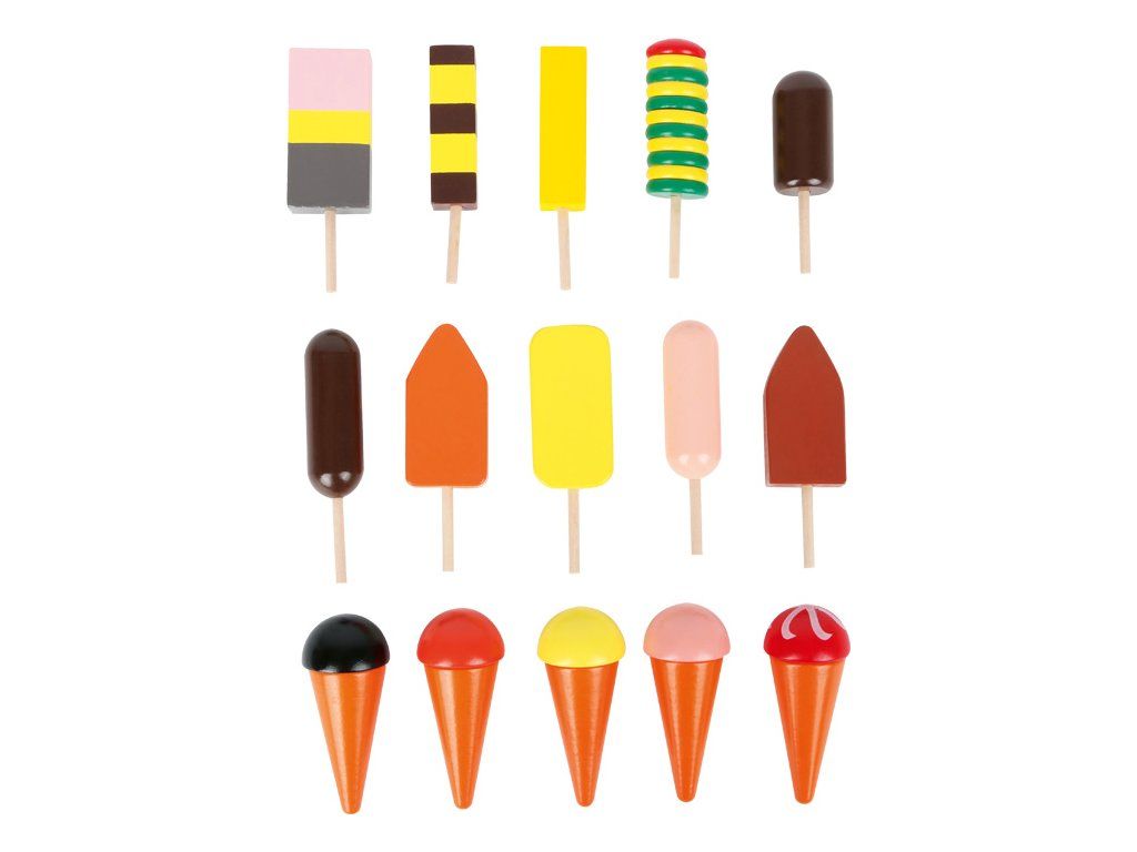 Děti pojďte do cukrárny. Tento třípatrový stojan má vše na co máte chuť. Zmrzlina na špejli nebo v kornoutku (8-10 cm) se dá aranžovat do připravených otvorů. Tento zmrzlinový stojan nabízí celkem 15 různých a barevně zdobených zmrzlinových příchutí. Je vyroben z barevně lazurovaného masivního dřeva a překližky. Prostě “cool” doplněk pro dětské kuchyně nebo obchodu s potravinami. Hlavní vlastnosti: vyrobeno ze dřevaobsahuje 15 dílůpodporuje hraní rolí v kuchyňkách a obchodechDoplňkové parametry