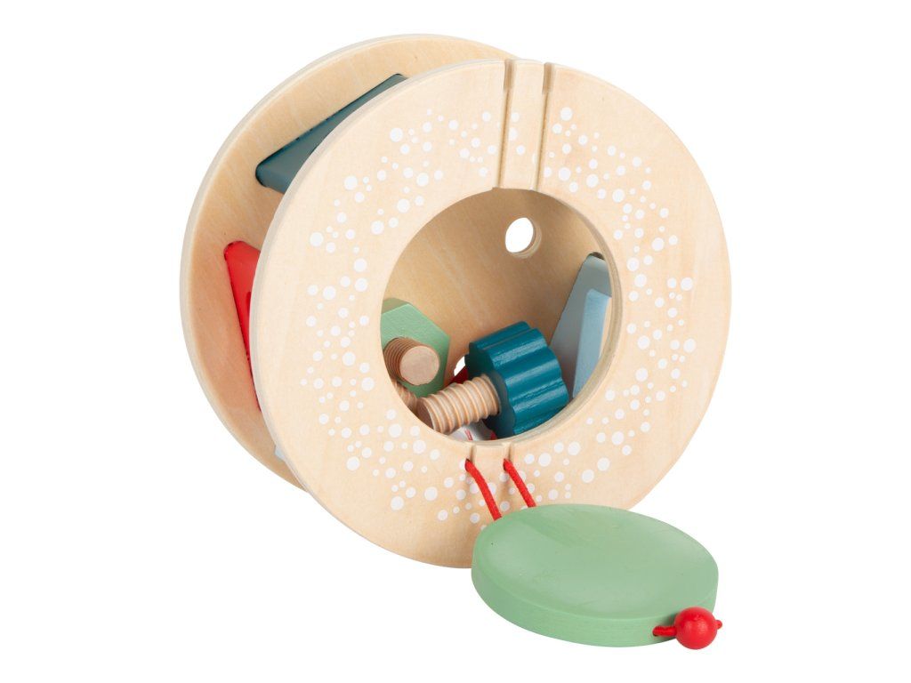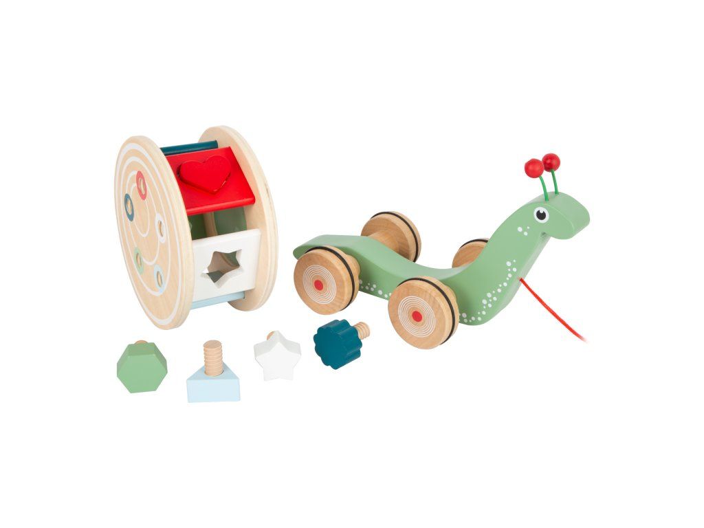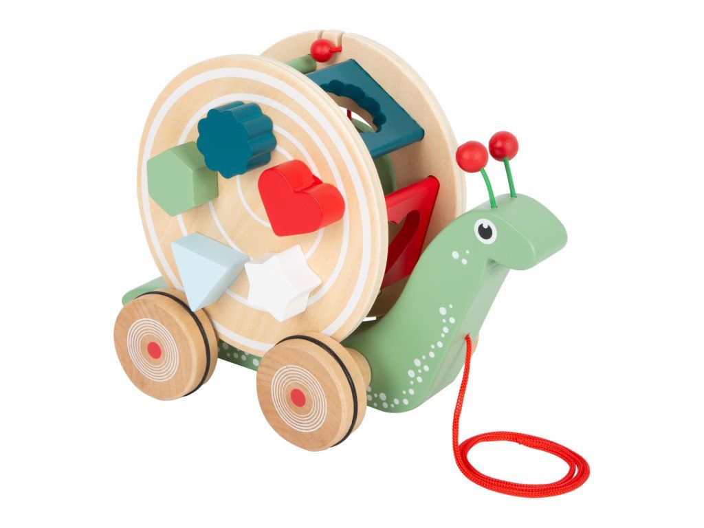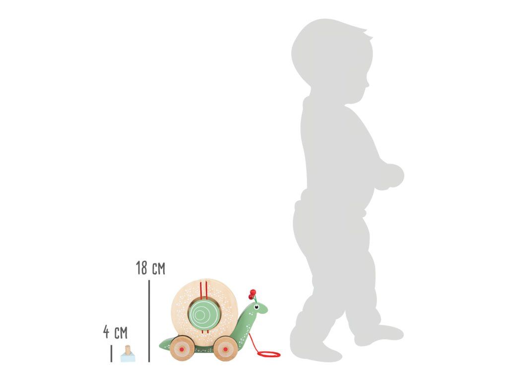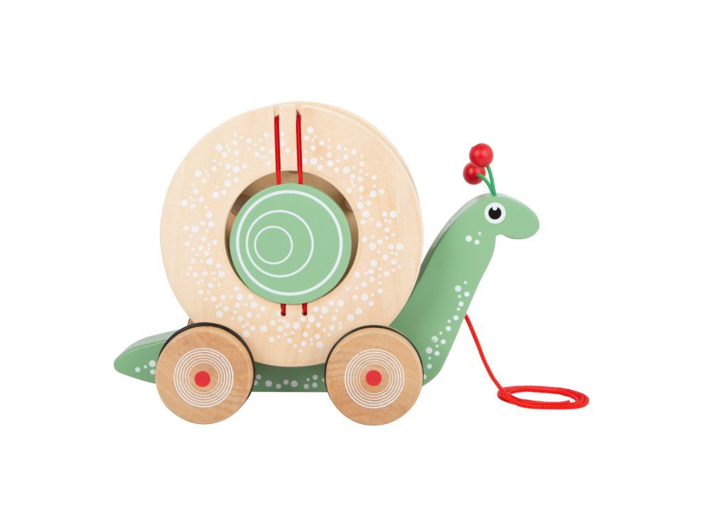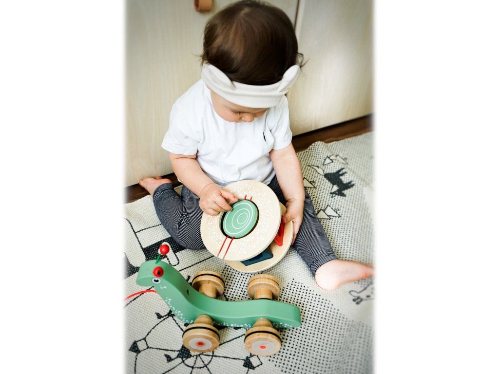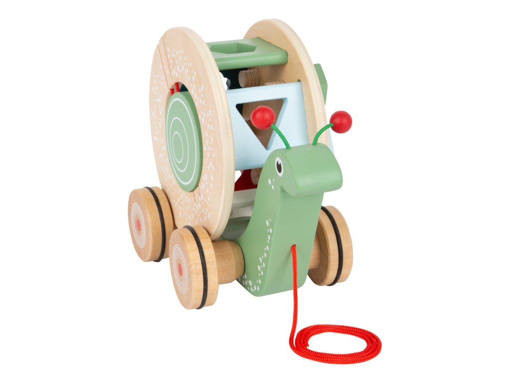 Tato dřevěná tahací hračka s přátelskýma očima, mnoha detaily a pogumovanými kolečky inspiruje děti k prvním krůčkům. Při tahání se šnekova ulita otáčí a dílky uvnitř vydávají zvuk. Dílky můžete pomocí jejich provázků také připevnit na stranu ulity. Hračka je mixem přírodního a barveného dřeva v moderních barvách. Šnekova ulita je oddělitelná a funguje jako vkládačka. Na straně ulity jsou oddělitelná dvířka, kterými můžete dílky z vkládačky opět vyndat. Můžete je také skladovat připevněné na ulitu, aby nevydávaly zvuk. Chytrá motorická hračka perfektní pro děti. Hlavní vlastnosti Tahací motorická a edukativní hračka v jednomOddělitelná ulita může být použita jako vkládačkaPři hře trénuje motoriku dětí různými způsobyPři hře stimuluje sluchový vjem dětíUlita má postranní dvířka, kterými lze jednoduše vyjmout vložené dílkyPogumovaná kolečka zajišťují tichý chodDoplňkové parametry