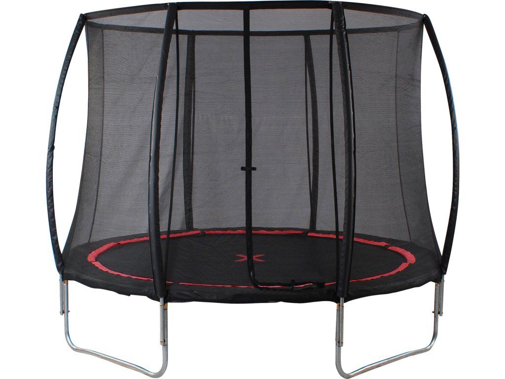Černá trampolína se sítí, s červeným označením, které odděluje část ke skákání od ochranných prvků. Sférický design konstrukce tyčí zajišťuje bezpečnost při skákání, tyče se totiž nedotýkají ochranné sítě. Navíc jsou tyče polstrované, což znamená ochranu navíc. Skvělý doplněk do každé zahrady či na hřiště. Nosnost do 120 kg umožní zábavu nejen dětem, ale i dospělým. Pouze pro soukromé použití!Doplňkové parametry