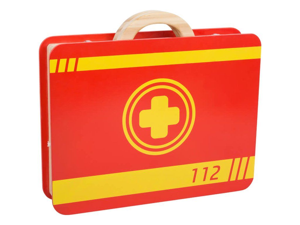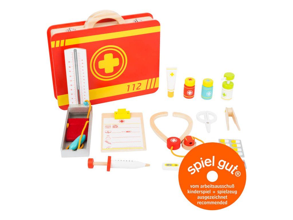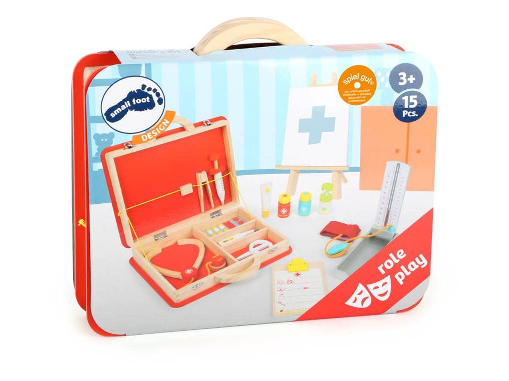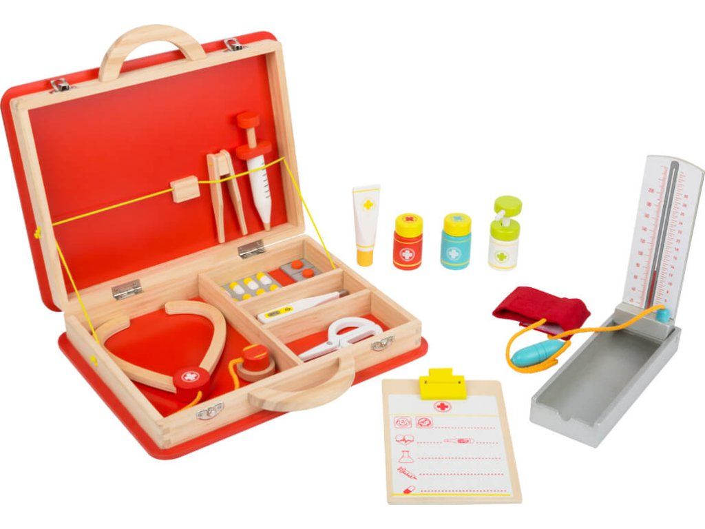 Trendy lékařská souprava v kufříku pro mladé doktory a doktorky. Všechny předstírané lékařské úkony u lékaře, nebo na pohotovosti, zvládnou děti v dětském pokojíčku s tímto dřevěným lékařským kufříkem.Početné náčiní splní přání každého mladého lékaře. Injekční stříkačky a nádobky na masti jsou dokonce vybaveny funkcí pumpy. Takto si mohou všechny panenky a medvídci nechat změřit krevní tlak a ošetřit drobné ranky. Všechna ošetření lze nakonec zapsat do praktické lékařské dokumentace. Komplexní vybavení včetně tlakoměru, lékařské dokumentace, stetoskopu, pinzety, teploměru, stříkačky, nůžek, dávkovače dezinfekčního roztoku s pumpičkou. Obsahuje také tubu na mast, nádobky na tablety a blistrové balení tablet. Hračka dětem pomůže s rozvojem sociálních dovedností a vypravěčství. Další, prosím! Hlavní vlastnosti: lékařská souprava se spoustou dřevěného lékařského vybavenípružné elastické pásky a oddělené přihrádky udrží léky a lékařské vybavení na místě klasické doktorské symboly a kresby, které jsou pro děti snadno srozumitelnépodporuje aktivní hraní a rozvíjí sociální dovednostiDoplňkové parametry