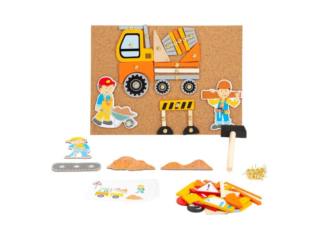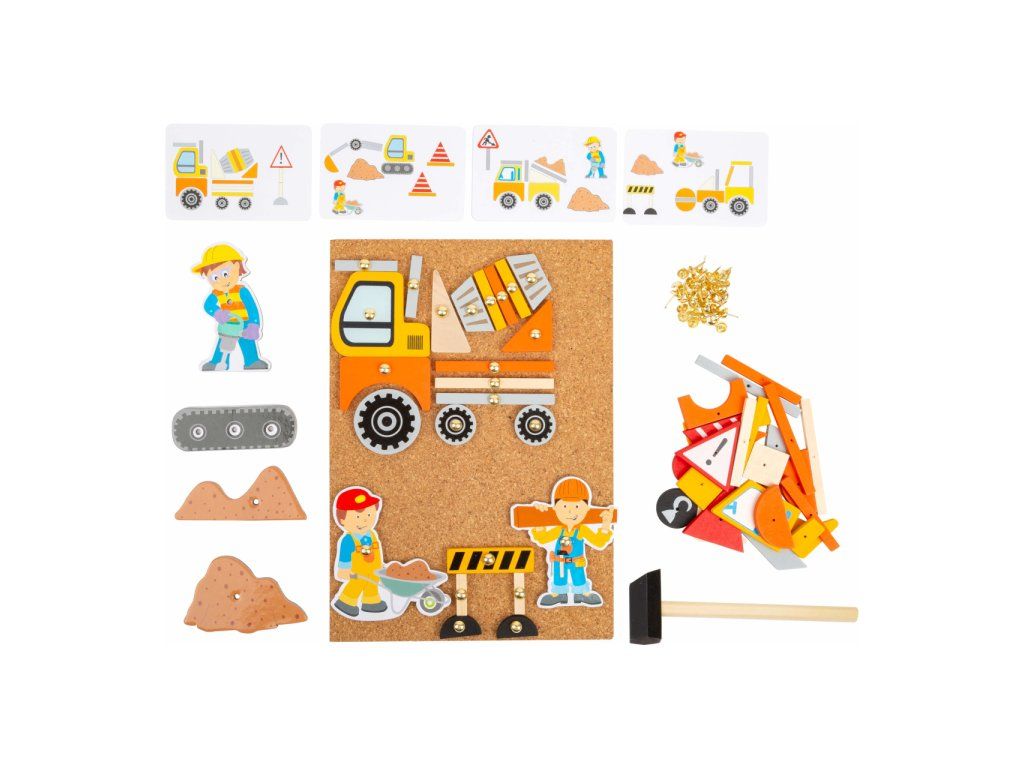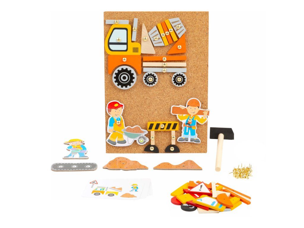 Doprava je zábava! Zatloukačka s kladivem a připínáčky. V balení najdete korkovou desku, kladivo, připínáčky a dřevěné objekty různých tvarů. Děti si mohou na desce/nástěnce díky zatlkoukačce vytvořit různé obrázky. Ať je to stavař, míchačka nebo jeřáb, tato sada obsahuje vše k vytvoření kouzelného obrazu. V balení najdete také obrázkové předlohy, z kterých se děti mohou inspirovat. Tato hra podporuje rozvoj kreativity a dá dětem vlastní prostor pro tvoření. Vše je zabaleno v praktickém boxu a tak se vám nic ze sady neztratí! Hlavní vlastnosti: podporuje kreativitu a koncentracipodporuje jemnou motorikupraktický úložný boxDoplňkové parametry