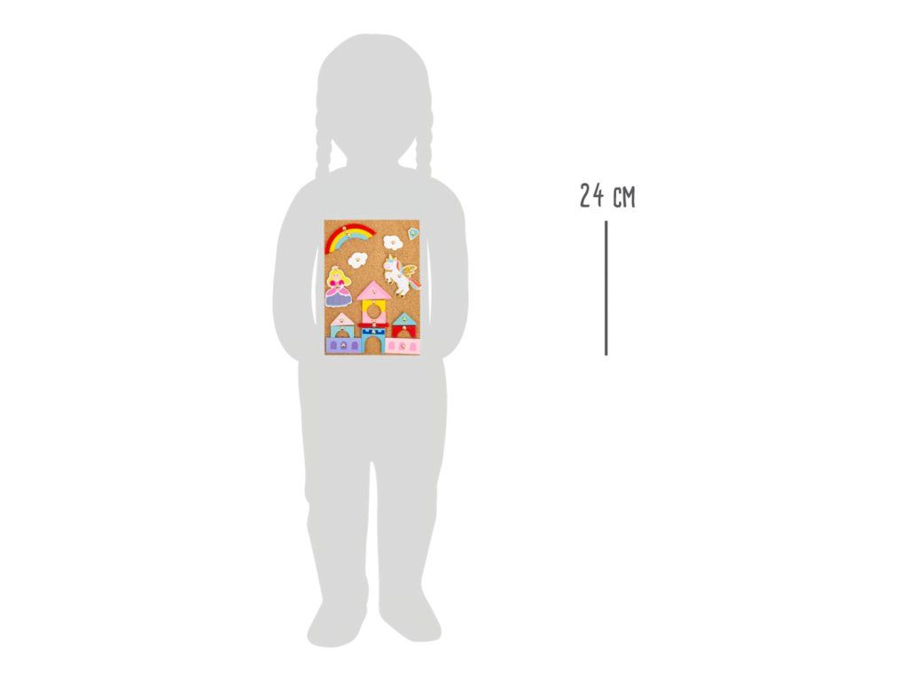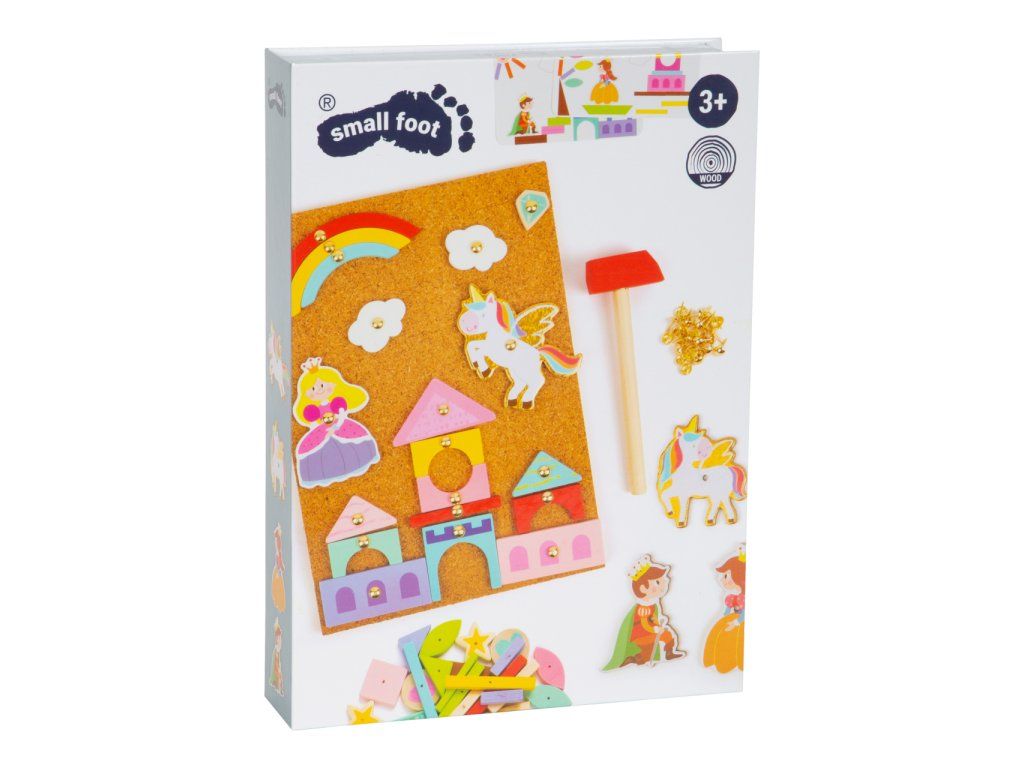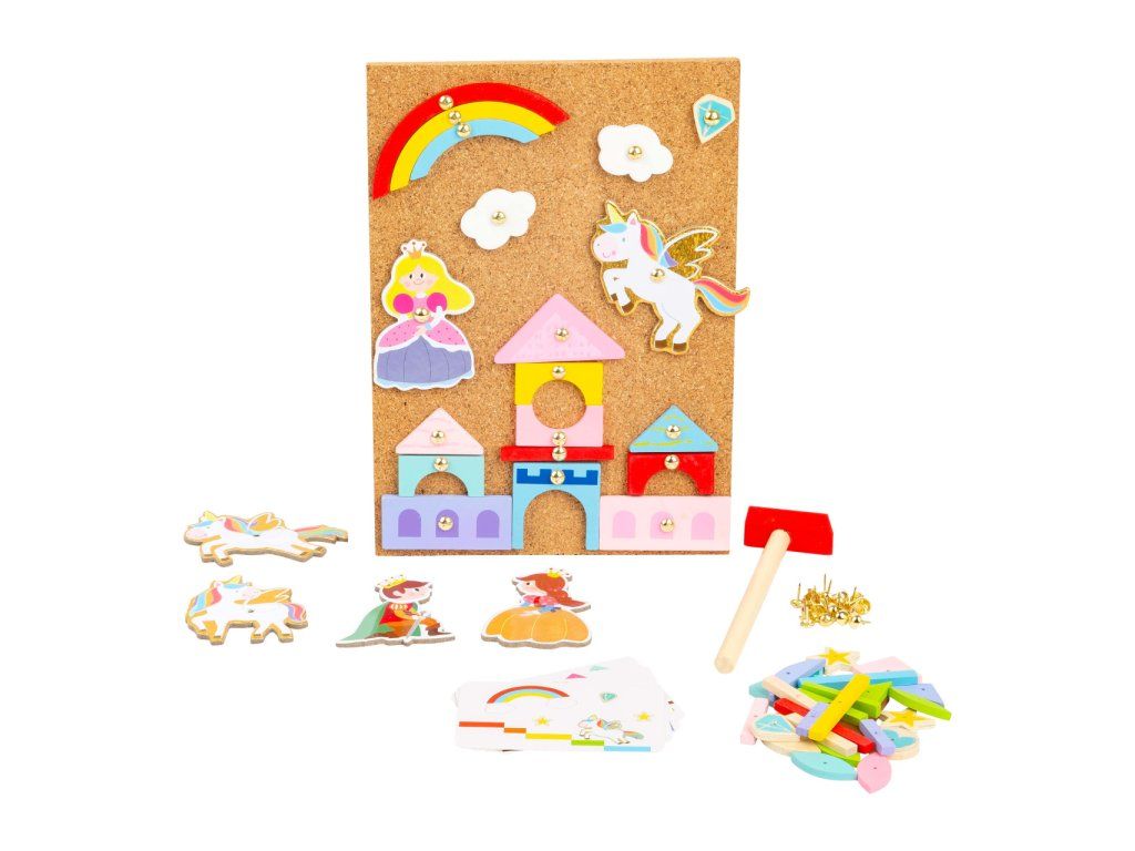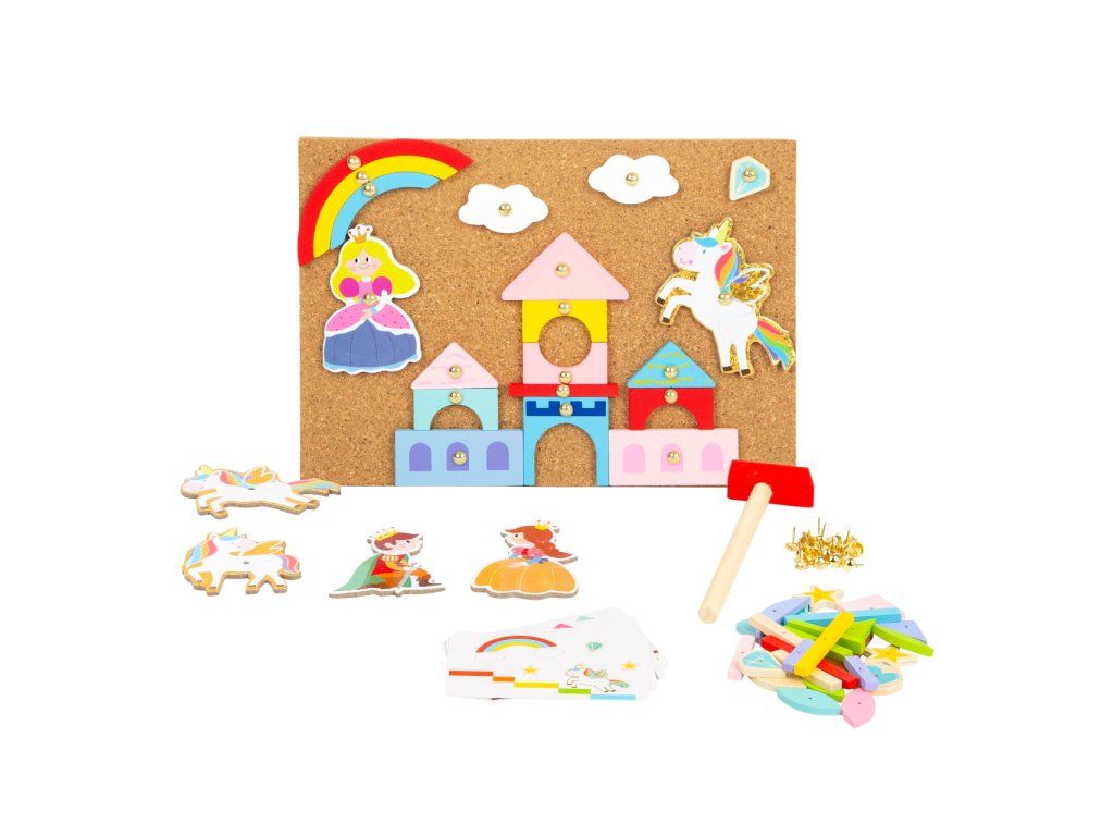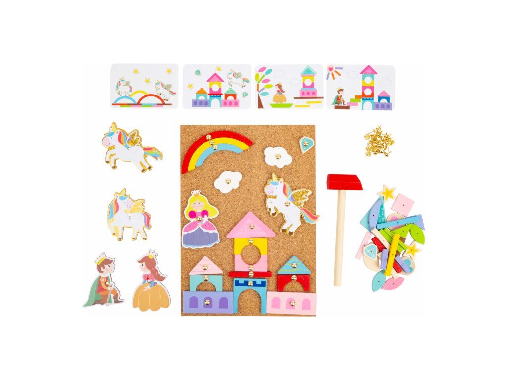 Magická zábava s kladivem a připínáčky. V balení najdete korkovou desku, kladivo, připínáčky a dřevěné objekty různých tvarů. Děti si mohou na desce/nástěnce díky zatlkoukačce vytvořit různé obrázky. Ať je to princezna, pohádkový hrad nebo jednorožec, obsauje tato sada vše k vytvoření kouzelného obrazu. V balení najdete také obrázkové předlohy, z kterých se děti mohou inspirovat. Tato hra podporuje rozvoj kreativity a dá dětem vlastní prostor pro tvoření. Vše je zabaleno v praktickém boxu a tak se vám nic ze sady neztratí! Hlavní vlastnosti: podporuje kreativitu a koncentracipodporuje jemnou motorikupraktický úložný boxDoplňkové parametry