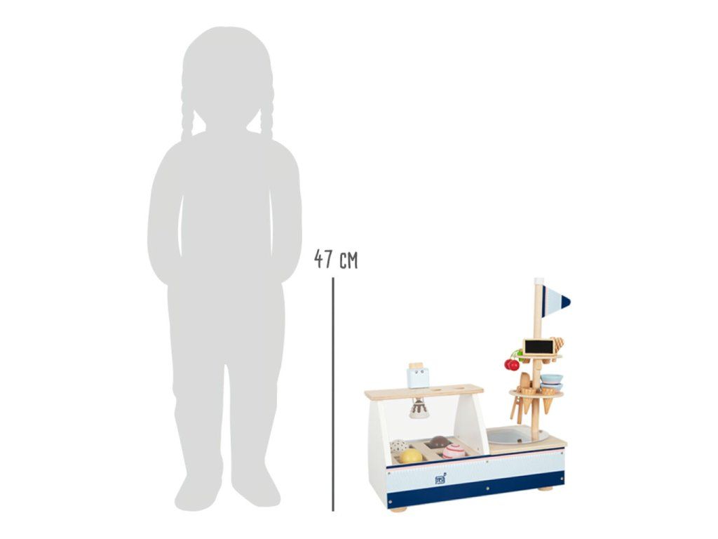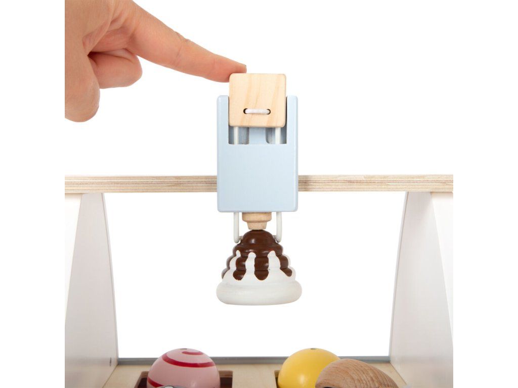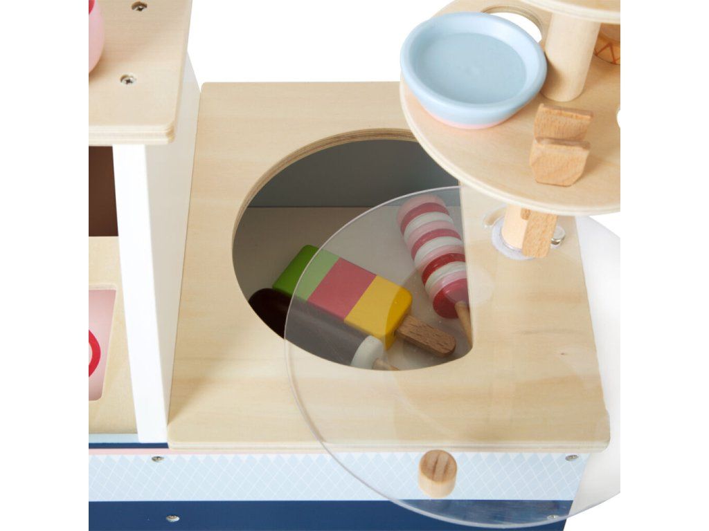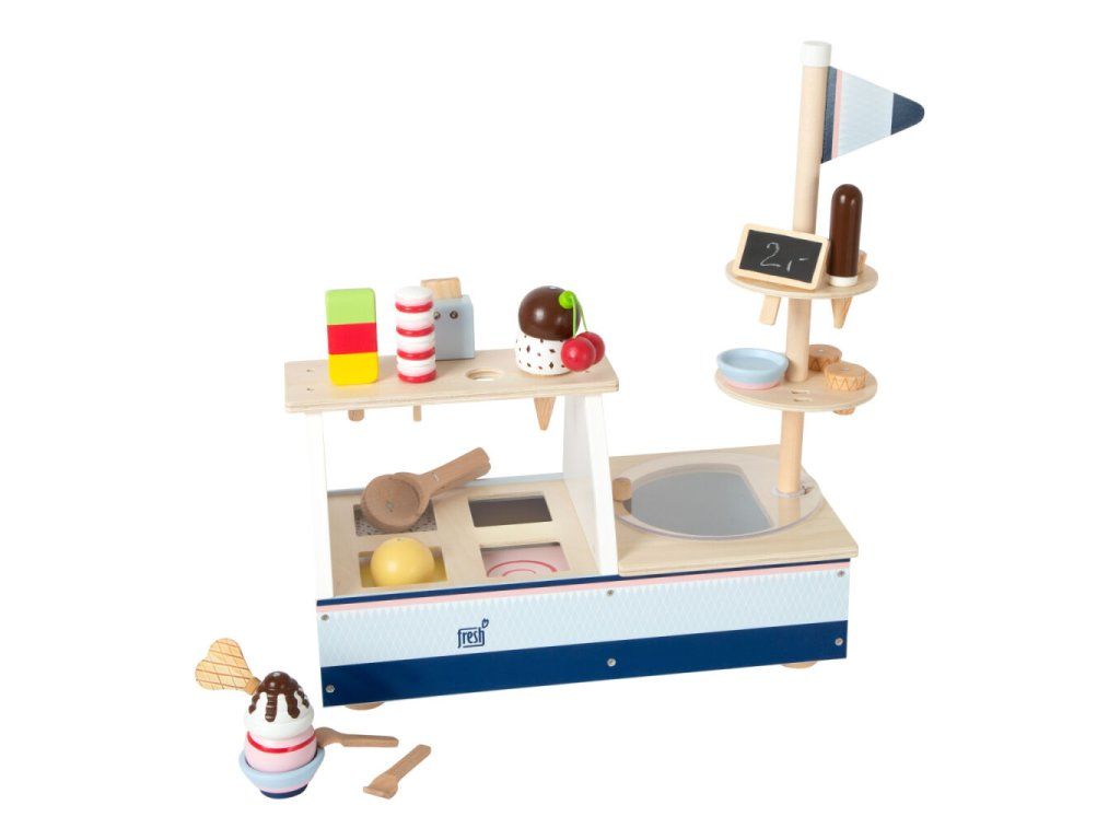 Jdeme na zmrzlinu! Tento dřevěný zmrzlinový set je perfektní na léto i zimu. Zmrzlinový stánek je modro-růžový, má také prvky přírodního dřeva, zákazníky nadchne velkým výběrem dezertů a svými funkcemi a příslušenstvím. Můžete si dát více kopečků zmrzliny, nanuk, točenou zmrzlinu, poháry, wafle... a to vše ozdobit třešničkou. Stánek má také plastovou vitrínu, mrazničku s plastovým poklopem, stojan na kornouty. Kopečky zmrzliny a točená zmrzlina jsou magnetické, v balení také najdete tabulku, na kterou můžete psát křídou. Zmrzlinu (vanilku, čokoládu, stracciatellu a jahodu) můžete z vitríny vyndat a dát ji do misky nebo kornoutu. Všechny se také vejdou na wafli. Vytvořte si dezert dle svého gusta. Zmrzlinový stánek má také úložný prostor. Hlavní vlastnosti Zmrlinové kopečky a točená zmrzlina s magnetyOsm různých příchutí zmrzliny, nanukyKopečky se dají skládat na sebe díky magnetůmVelké a malé zmrzlinové kornouty, misky se lžícemi, wafleStánek s plastovou vitrínou, mraznička s průhledným poklopemGenderově neutrální, jemný designDoplňkové parametry