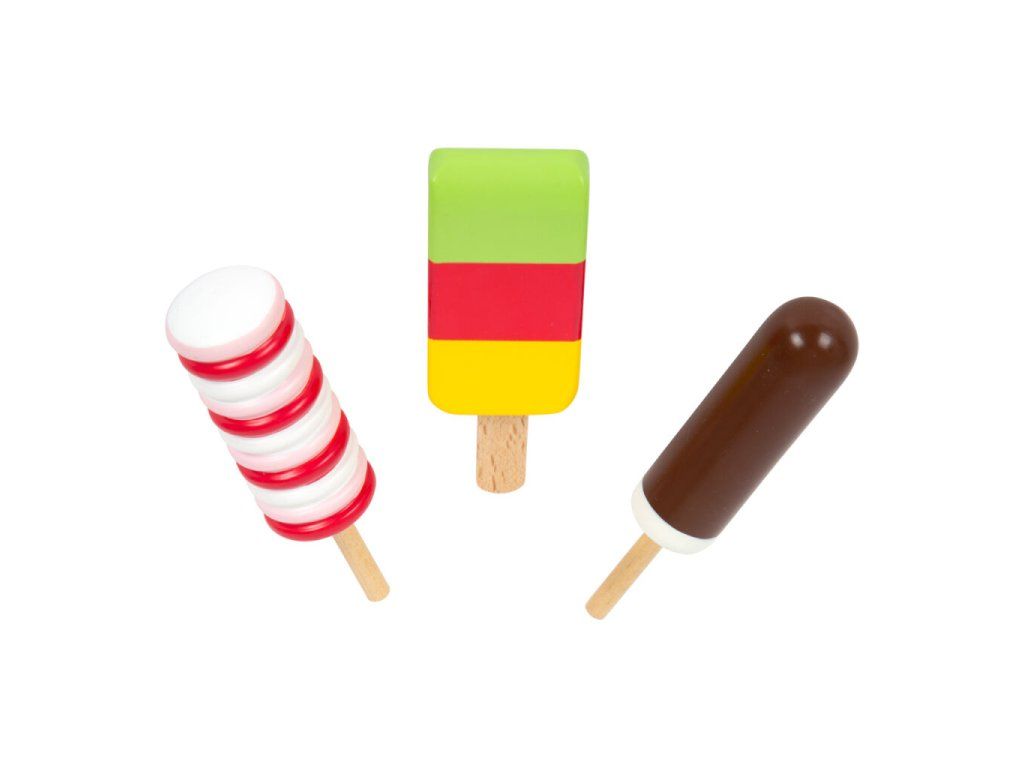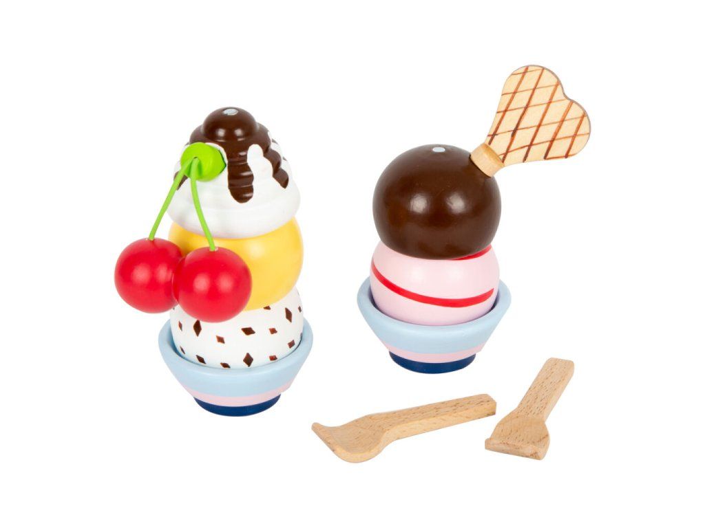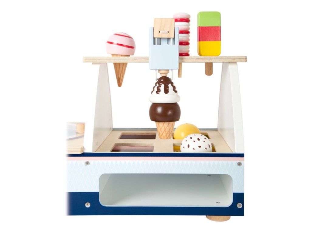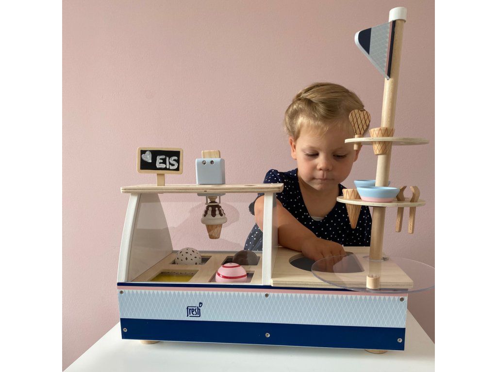 Jdeme na zmrzlinu! Tento dřevěný zmrzlinový set je perfektní na léto i zimu. Zmrzlinový stánek je modro-růžový, má také prvky přírodního dřeva, zákazníky nadchne velkým výběrem dezertů a svými funkcemi a příslušenstvím. Můžete si dát více kopečků zmrzliny, nanuk, točenou zmrzlinu, poháry, wafle... a to vše ozdobit třešničkou. Stánek má také plastovou vitrínu, mrazničku s plastovým poklopem, stojan na kornouty. Kopečky zmrzliny a točená zmrzlina jsou magnetické, v balení také najdete tabulku, na kterou můžete psát křídou. Zmrzlinu (vanilku, čokoládu, stracciatellu a jahodu) můžete z vitríny vyndat a dát ji do misky nebo kornoutu. Všechny se také vejdou na wafli. Vytvořte si dezert dle svého gusta. Zmrzlinový stánek má také úložný prostor. Hlavní vlastnosti Zmrlinové kopečky a točená zmrzlina s magnetyOsm různých příchutí zmrzliny, nanukyKopečky se dají skládat na sebe díky magnetůmVelké a malé zmrzlinové kornouty, misky se lžícemi, wafleStánek s plastovou vitrínou, mraznička s průhledným poklopemGenderově neutrální, jemný designDoplňkové parametry