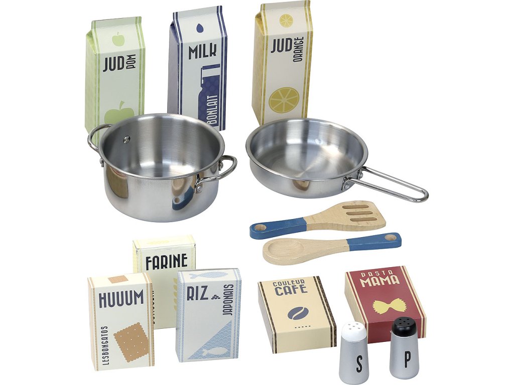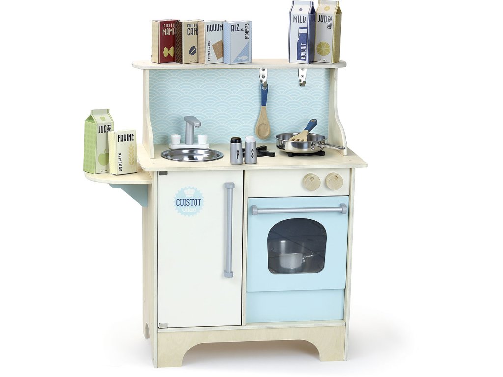 Pokud máte doma nadšené pomocníky, určitě se jim bude líbit tato kuchyňka v modré barvě. Možná se díky této hračce děti v budoucnu stanou špičkovými kuchaři a kuchařkami. V balení kromě čepice a zástěry šéfkuchaře najdete také solničku a pepřenku, vařečku, hrnec, pánev a 8 tetrapaků s potravinami. Kuchyňka má samozřejmě dřez, troubu, sporák s klikajícími ciferníky a mnoho úložného prostoru. Po rozbalení nutno složit. Vhodné od 3 let. Hlavní vlastnosti: včetně 24 ks doplňkůpevná dřevěná konstrukcefunkční a odnímatelné prvkyDoplňkové parametry