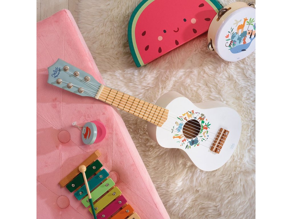 Každé dítě sní o tom, že se stane hvězdou a zahraje nezapomenutelné kytarové sólo. Tato krásná dřevěná kytara, jemně ilustrovaná umělkyní Sarah Betz, je ideální pro děti od 3 let, které chtějí napodobovat dospělé a vydat se na svou hudební cestu.Vyrobena z masivního dřeva, s přizpůsobenou velikostí a náhradními nylonovými strunami, nabízí čisté tóny bez elektroniky a umožňuje dětem objevovat radost z hudby přirozeným způsobem. Klepání a brnkání na struny pomáhá rozvíjet jemnou motoriku, koordinaci ruka–oko a posiluje svaly prstů, což jsou důležité dovednosti pro další učení, například psaní.Hraní na tuto kytaru zároveň rozvíjí hudební cítění, rytmus a schopnost chápat příčinu a následek, takže zábava a rozvoj jdou ruku v ruce. Připravte své dítě na velký koncert v srdci domova! Kytara vydává krásné zvuky a rozvíjí vztah k hudbě, ale není to profesionální hudební nástroj. Hračka není dokonale naladěná, slouží především k zábavě. Hlavní vlastnosti: 6-strunná kytaraprohlubuje lásku k hudbě a rytmikurozvíjí jemnou motoriku a kreativitudesign Sarah Betzkvalitní zpracováníDoplňkové parametry