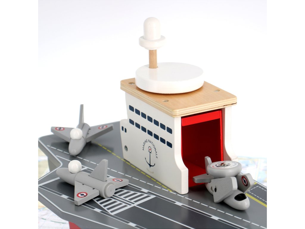 S letadlovou lodí mohou Vaše děti vyrazit na širé moře bránit mír a bezpečí. Je vybavena řadou letadélek i jiných strojů a nabízí dostatek prostoru pro hry s figurkami, nebo i dalšími hračkami. Jako praktický úložný prostor pro příslušenství dodávané s lodí může sloužit rozměrné podpalubí ukryté za dvojicí různých dvířek. S palubou je funkčně propojeno výtahem ve věži, který je nápaditě ovládán kolem v podobě radaru, umístěným na střeše. Hračka je vyrobena ze silné a odolné, přitom ale lehké překližky. Svou barevností a malovanými detaily věrně napodobuje skutečné letadlové lodě, samozřejmě nejsou opominuty ani výsostné znaky francouzského námořnictva. Hlavní vlastnosti: letadlová loď, 2 stíhačky, 1 průzkumný letoun, helikoptéra a servisní vozidlopraktický úložný prostor v podpalubífunkční výtah spojující palubu s podpalubímatraktivní a odolné dřevěné zpracování Šťastnou plavbu! To je přání námořníkům, kteří vyráží na moře. Toto přeje i Vilac, se svou kolekcí, kterou vyvinuli ve spolupráci s francouzským námořnictvem. Vůni moře vítr dofoukal až do pohoří Jura, výsledek jistě potěší malé námořníky a námořnice, také dospělé, kteří pečují o své vnitřní dítě!Doplňkové parametry