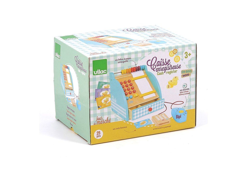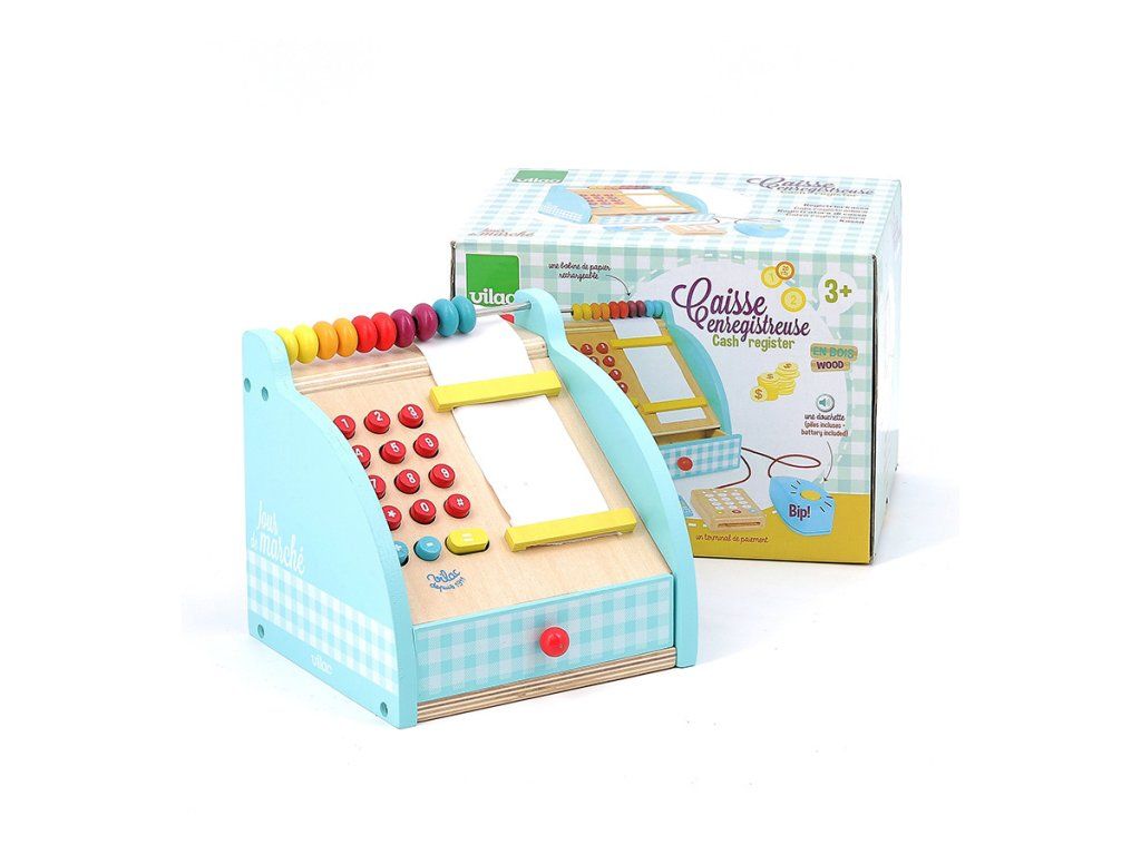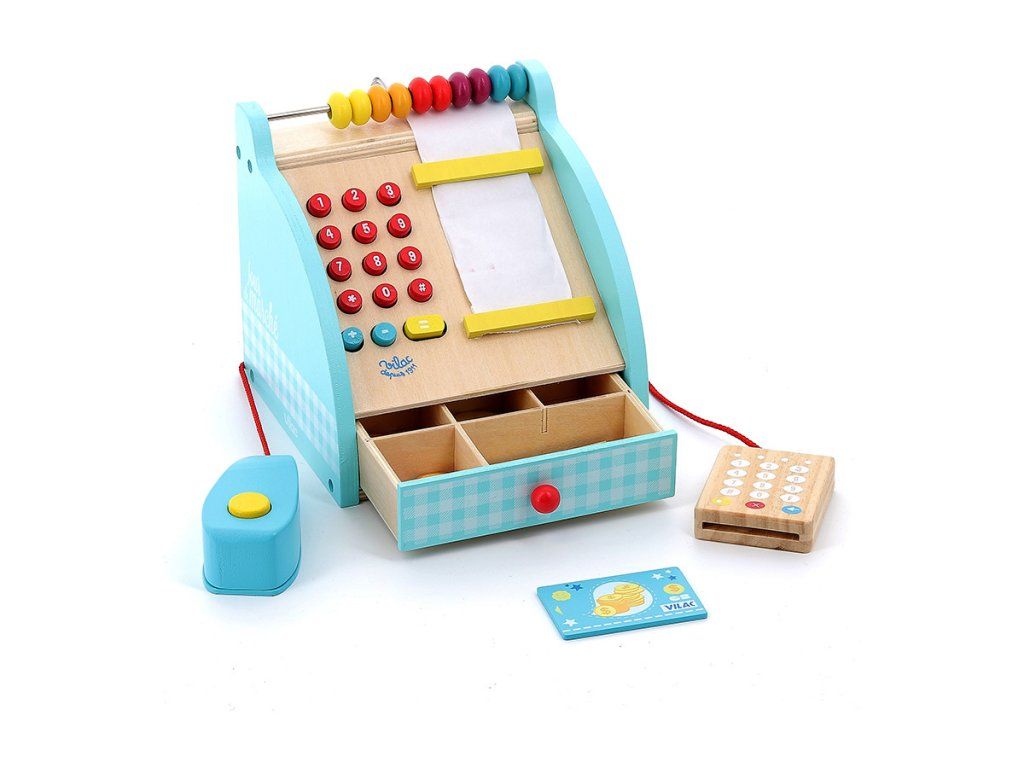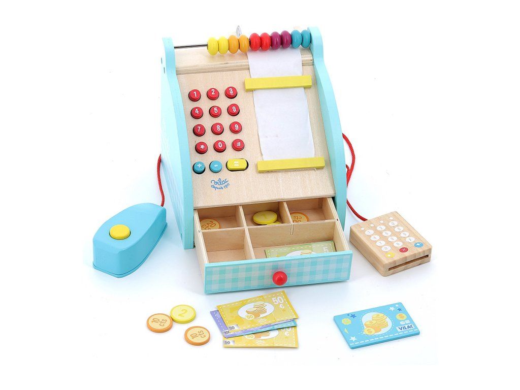 Poškozený obal. Nové zboží bez závad. Dřevěná pokladna s šuplíkem na peníze, počítadlem a bankovním terminálem. Obsahuje také klasické zvukové tlačítko a funkční numerickou klávesnici. Mezi doplňky patří bankovky a mince. Hlavní vlastnosti: rozvíjí komunikační dovednosti a sociální interakcifunkční prvky pokladny jako tlačítka a šuplík na penízevčetně příslušenstvíDoplňkové parametry