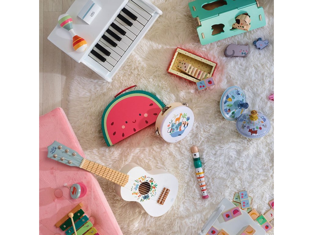 Tato jemně ilustrovaná tamburína od výtvarnice Sarah Betz není jen hudebním nástrojem, ale i krásnou pozvánkou do světa rytmu, zvuků a objevování. Ideální pro děti od 3 let, podporuje přirozený rozvoj jemné motoriky, rytmického cítění a kreativity. Klepáním či třesením se dítě učí ovládat pohyby rukou, zlepšuje koordinaci ruka–oko a posiluje svaly, které využije i při dalších dovednostech, třeba psaní. Hra na tamburínu rozvíjí sluch, soustředění i schopnost rozpoznávat a tvořit jednoduché rytmy. Díky nádhernému designu a přirozenému zvuku se tamburína stává milým společníkem pro volnou hru, sebevyjádření a první hudební dobrodružství. Taburína vydává krásné zvuky a rozvíjí vztah k hudbě, ale není to profesionální hudební nástroj. Hračka není dokonale naladěná, slouží především k zábavě. Hlavní vlastnosti: prohlubuje lásku k hudbě a rytmikurozvíjí jemnou motoriku a kreativitudesign Sarah Betzkvalitní zpracováníDoplňkové parametry