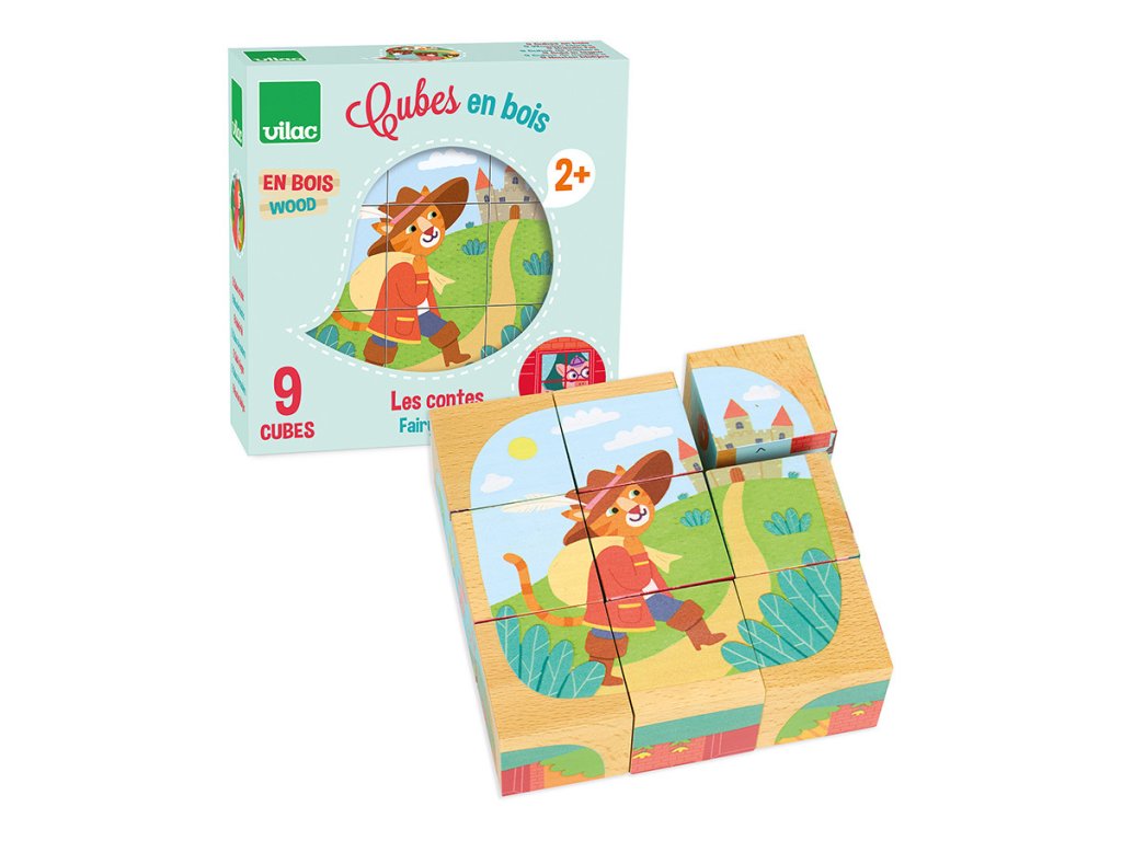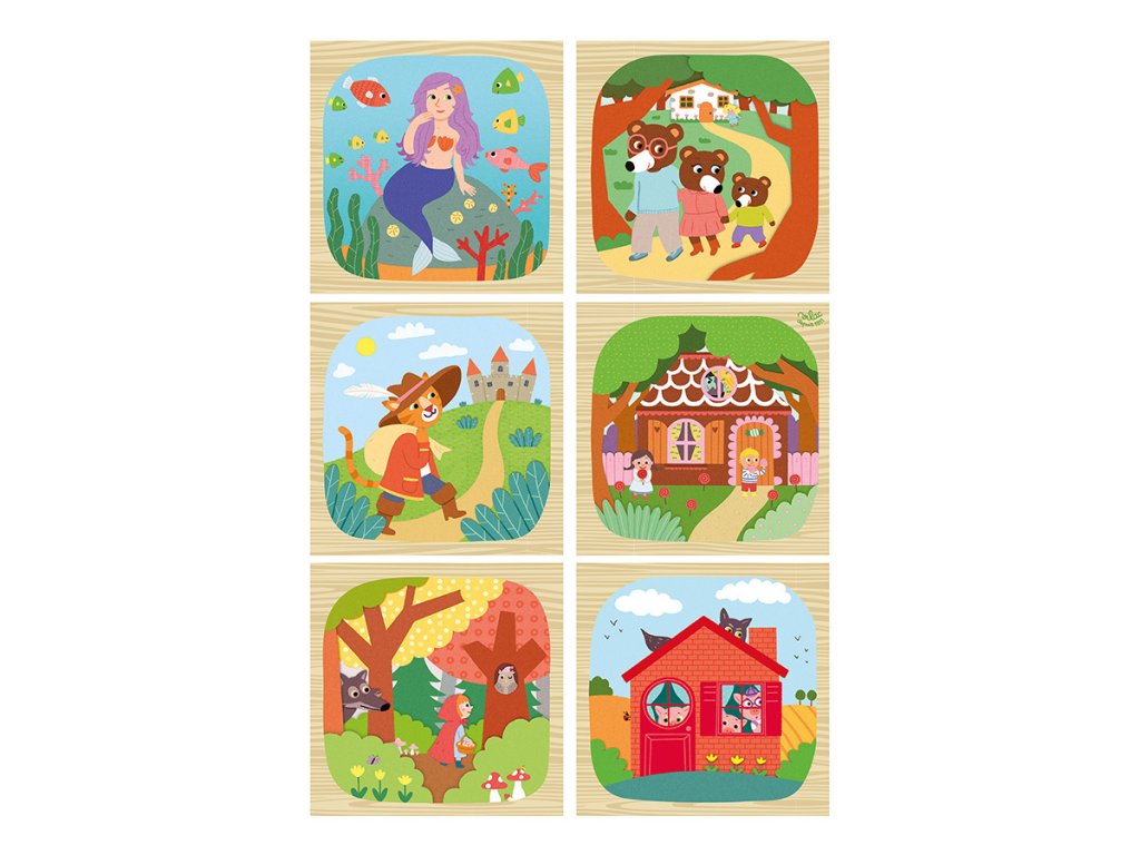 Devět dřevěných kostek s ilustracemi, z kterých je možno postavit šest velkých obrázků z dětských pohádek – Malá mořská víla, Kocour v botách, Perníková chaloupka... Hlavní vlastnosti: jednoduché obrázky na kostkách po sestavenítrénuje logické myšleníDoplňkové parametry
