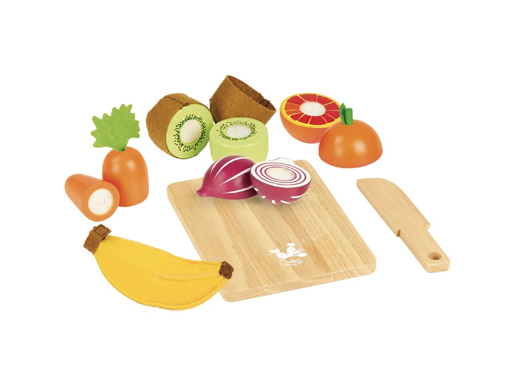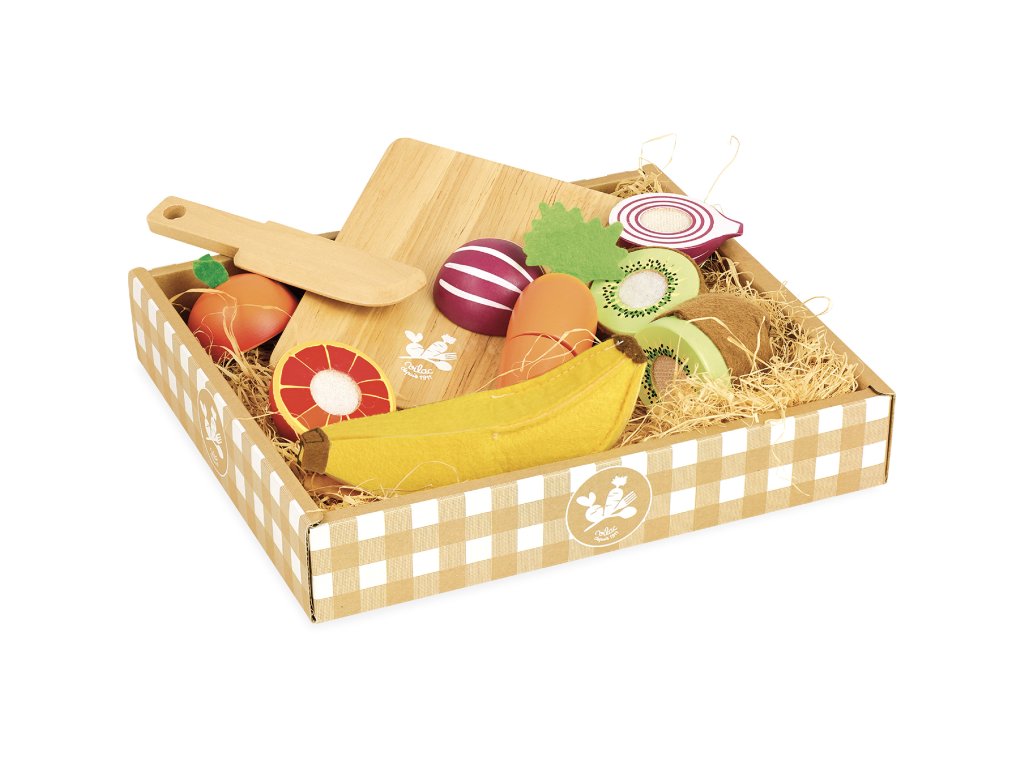 Košíček s pěti typy ovoce a zeleniny, který má v balení také krájecí desku a nůž, vše je vyrobeno ze dřeva. Skvělý doplněk do kuchyněk Vašich dětí. Hlavní vlastnosti: vhodné do každé kuchyňkypotraviny vyrobené ze dřevaDoplňkové parametry