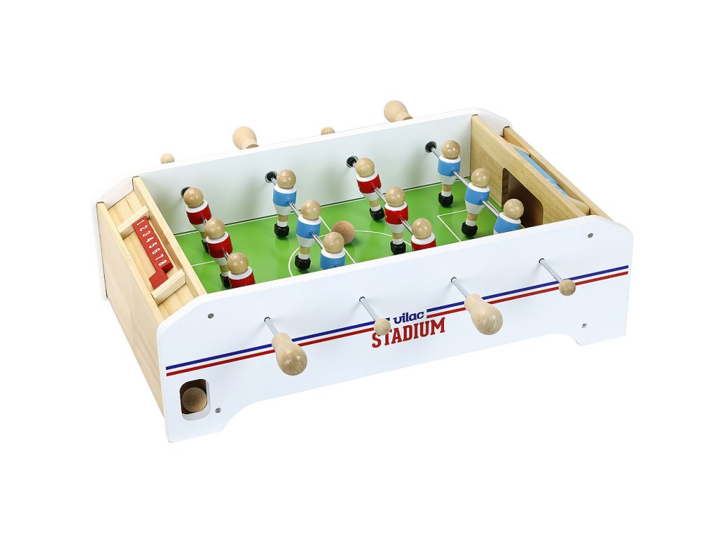 Dřevěný malovaný stolní fotbálek pro děti od 4 let. Hráči se snaží dát protivníkovi gól, pokud se jim to podaří, zaznačí si tuto změnu na ukazateli skóre. Každý hráč hraje s 6 figurkami na 2 tyčích s madly. V balení také 3 míčky. Hlavní vlastnosti: oblíbená hračka v dřevěné podoběsoučástí balení jsou 3 míčkypočítadlo nad brankamiDoplňkové parametry