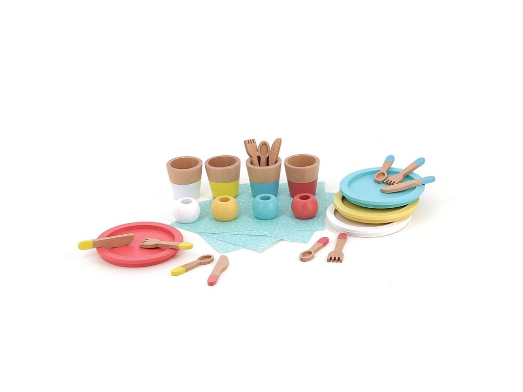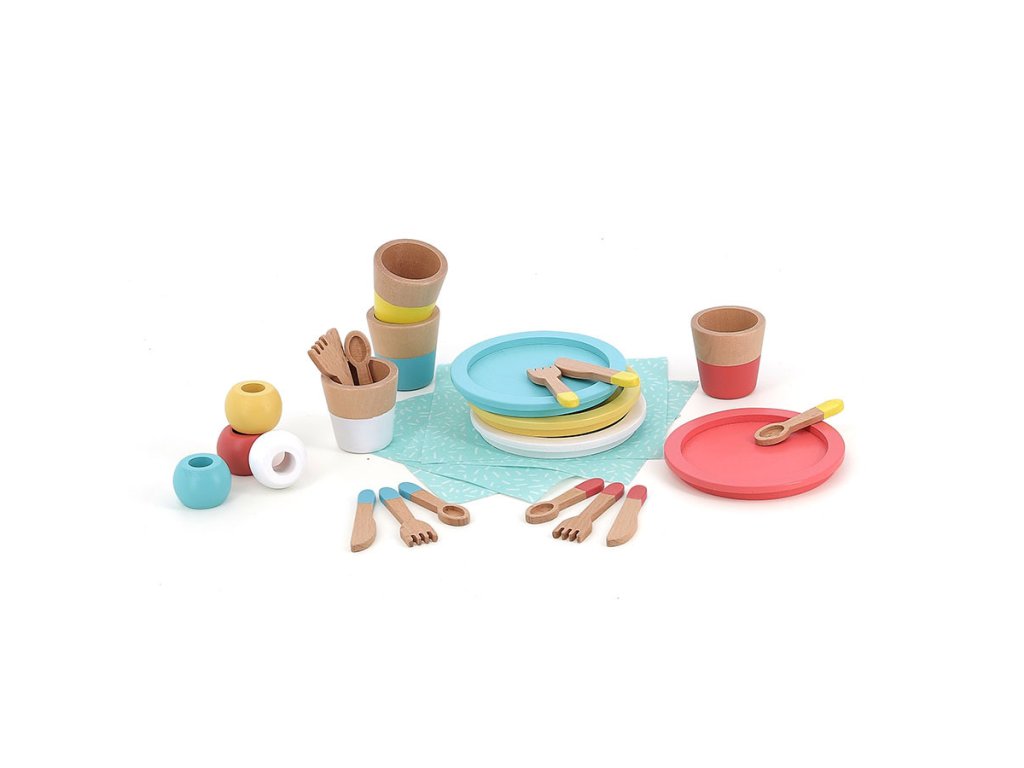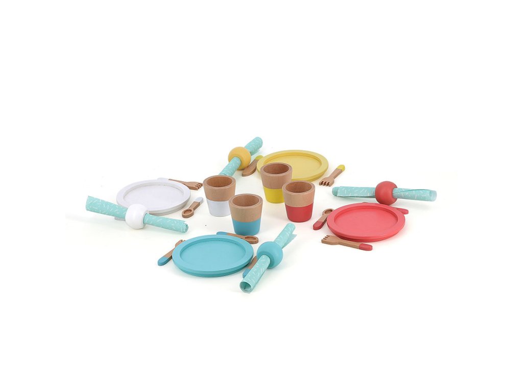 Je čas pozvat všechny kamarády na oběd! S touto jídelní sadou nádobí si Vaše dítě může vymýšlet krásné okamžiky plné fantazie a napodobování dospělých. Sada obsahuje 28 ks dřevěného nádobí - 4 talíře, 4 pohárky, 4 vidličky, 4 nože, 4 lžíce, 4 ubrousky včetně 4 kroužků. Hraní s touto jídelní sadou má mnoho výhod pro vývoj dětí. Podporuje představivost a kreativitu tím, že podporuje hraní rolí a vyprávění příběhů. Je také odolnější než plastové hračky, nabízí příjemný smyslový zážitek s přirozenou texturou a podporuje rozvoj jemné motoriky. Podporuje výměnu a interakci mezi dětmi, dospělými, plyšovými hračkami. Podporuje socializaci a rozvíjí sebevědomí. Hlavní vlastnosti: rozvoj jemné motoriky - umísťovat, nalévat, aranžovat, skládat, přemisťovatpodporuje socializaci a rozvíjí sebevědomídekorováno pomocí netoxických barevpodporuje hraní rolí a vyprávění příběhůpomáhá s učením a rozvojemDoplňkové parametry