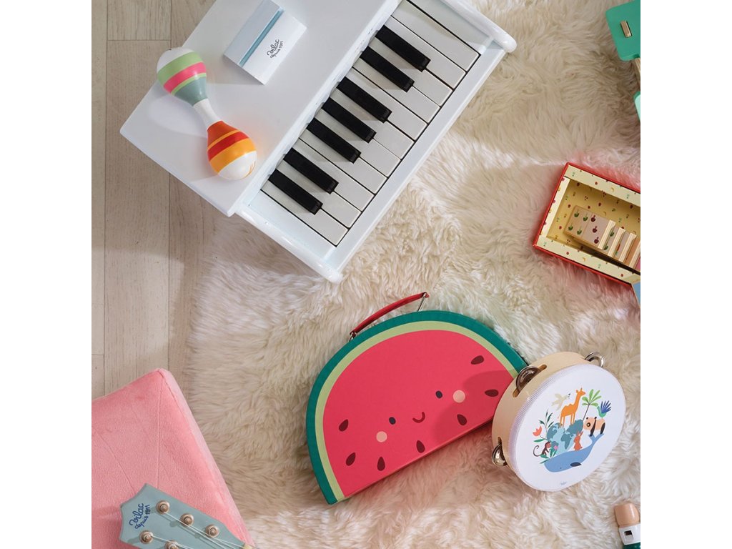 Kdo jako malý nesnil o tom stát se virtuózem? Dřevěné piáno s jemnými ilustracemi od Sarah Betz otevírá dětem od 3 let dveře do světa hudby hravou a přirozenou cestou.Piáno je vyrobené z masivního dřeva, má velikost ideální pro malé ručičky a je dodáváno s 10 notami, které děti seznámí se základy hudby. Bez potřeby elektroniky umožňuje vytvářet melodie, objevovat rytmus a zažívat radost ze hry. Tato hudební hračka rozvíjí jemnou motoriku, koordinaci ruka–oko, posiluje prsty a pomáhá budovat obratnost – dovednosti důležité i pro psaní nebo další kreativní činnosti. Hraní na klávesy navíc pomáhá chápat vztahy mezi akcí a zvukem, což podporuje logické myšlení i trpělivost. Piáno vydává krásné zvuky a rozvíjí vztah k hudbě, ale není to profesionální hudební nástroj. Hračka není dokonale naladěná, slouží především k zábavě. A jako bonus? Díky elegantnímu lesklému laku se piáno stane i stylovým doplňkem dětského pokoje nebo obýváku. Hlavní vlastnosti: piano s 18 klávesamiprohlubuje lásku k hudbě a rytmikurozvíjí jemnou motoriku a kreativitustimulace kreativitydesign Sarah Betzkvalitní zpracováníDoplňkové parametry