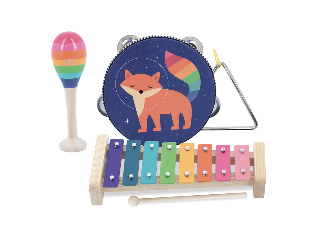 Nechť hudba zní! Souprava pestrobarevných perkusních nástrojů zdobených motivy výtvarníka Andyho Westface. Skládá se z xylofonu, tamburíny, trianglu a maracas. Jejich prostřednictvím mohou děti budovat svůj vztah k hudbě, cit pro rytmus i melodii. Hrou s nástroji lze rozvíjet jemnou motoriku, prohlubovat fantazii a kreativní dovednosti. Díky kombinaci kovu a dřeva jsou pevné, odolné a mohou nabídnout dlouhou životnost. Hlavní vlastnosti: xylofon s paličkou, triangl, tamburína a maracasdesign Andy Westfacepevné a odolné provedení Andy Westface je ilustrátor žijící a působící v Hongkongu. Svou prací se snaží zprostředkovat silné pocity a jasné myšlenky za pomoci jednoduchých tvarů, kompozic i barevnosti. Typickými prvky jeho děl jsou zvířata a duha, které si oblíbil pro jejich čistotu, upřímnost a schopnost vzbuzovat radost.Doplňkové parametry
