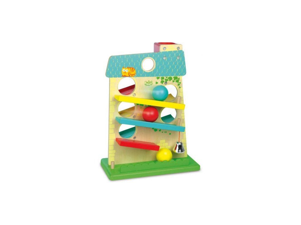 Poškozený obal. Nové zboží bez závad. Dřevěný kaskádový domek je krásná dřevěná hračka, s kterou si děti užijí mnoho zábavy. Domek má 3 rampy na obou stranách a tak se dřevěné míčky pohybují shora dolů, ze strany na stranu. A když míček dojede do cíle, zazvoní kovový zvoneček. Hlavní vlastnosti: univerzální designpoutavá hračka podporující logické myšleníDoplňkové parametry