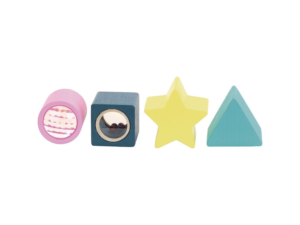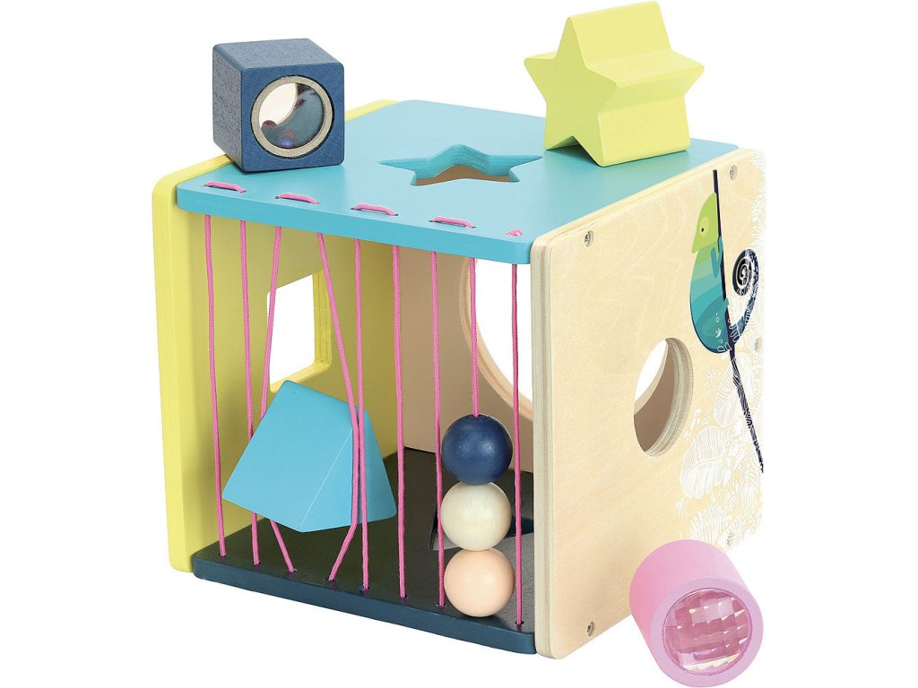 Vkládací dřevěná kostka s 4 různými tvary. Kaleidoskopický válec, zvuková kostka, hvězdička a trojúhelník pomohou rozvíjet jemnou motoriku, senzorické funkce a poznávání barev při vkládání do příslušných otvorů motorické kostky. Z jedné strany má kostka pružné šňůrky s korálky. Hlavní vlastnosti: moderní originální designnové herní prvky v podobě senzorických kostek a pružných šňůrekrozvíjí motoriku, senzorické funkce a poznávání barevDoplňkové parametry