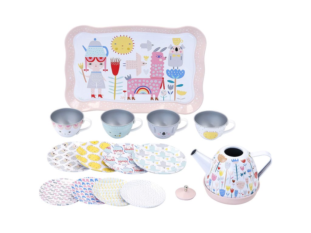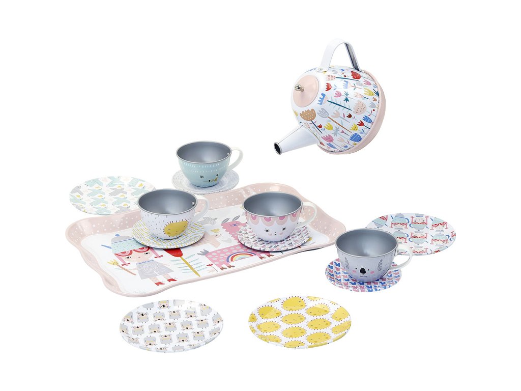 Krásná čajová souprava z kovu s ilustracemi Suzy Ultman. Skládá se z hudební konvice, 4 šálků a podšálků, 4 dezertních talířů a podnosu. Hudební konvice? Ano, když ji nakloníte – například při rozlévání čaje, začne hrát melodii písně „Hodně štěstí, zdraví“. Vše zabaleno v lepenkovém kufříku, takže je tato sada perfektní i na piknik. Vhodné od 3 let. Hlavní vlastnosti: obsahuje 14 ksoriginální design Suzy Ultman kovové nádobíkonvice v sobě ukrývá natahovací hrací strojek Suzy Ultman od dětství vytvářela hračky a knížky pro svou rodinu a přátele. Rozená vypravěčka, Suzy je také ilustrátorkou, produktovou designérkou, tvůrkyní hraček a knížek. Vytváří hlavně sofistikované a jednoduché předměty, které inspirují a potěší mladé i staré. Suzy vyrostla v Pensylvánii, ale její život a práce ji přivedly k cestám po světě, nejen jako turistku. Žila v městech od Los Angeles po Portland, přes moře v Amsterdamu a pak zpět v Bostonu. Suzyiny poznatky z těchto míst ji výrazně ovlivňují v tvorbě, ať už jde o zkrášlení Vaší knihovny nebo o výzdobu dětského pokoje, produkty Suzy vychází z malých detailů našeho vnitřního světa, které nás umí rozesmát, které nás spojují s lidmi po celém světě. Když zrovna ve své dílně neskládá papír, nedesignuje textilie nebo nevytváří hračky, najdete ji ve starožitnictvích, ve kterých hledá poklady, na bleším trhu, nebo v přírodě.Doplňkové parametry