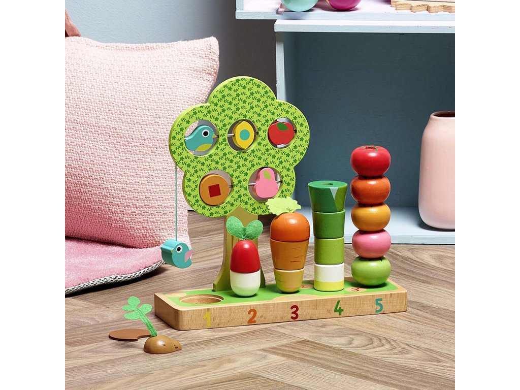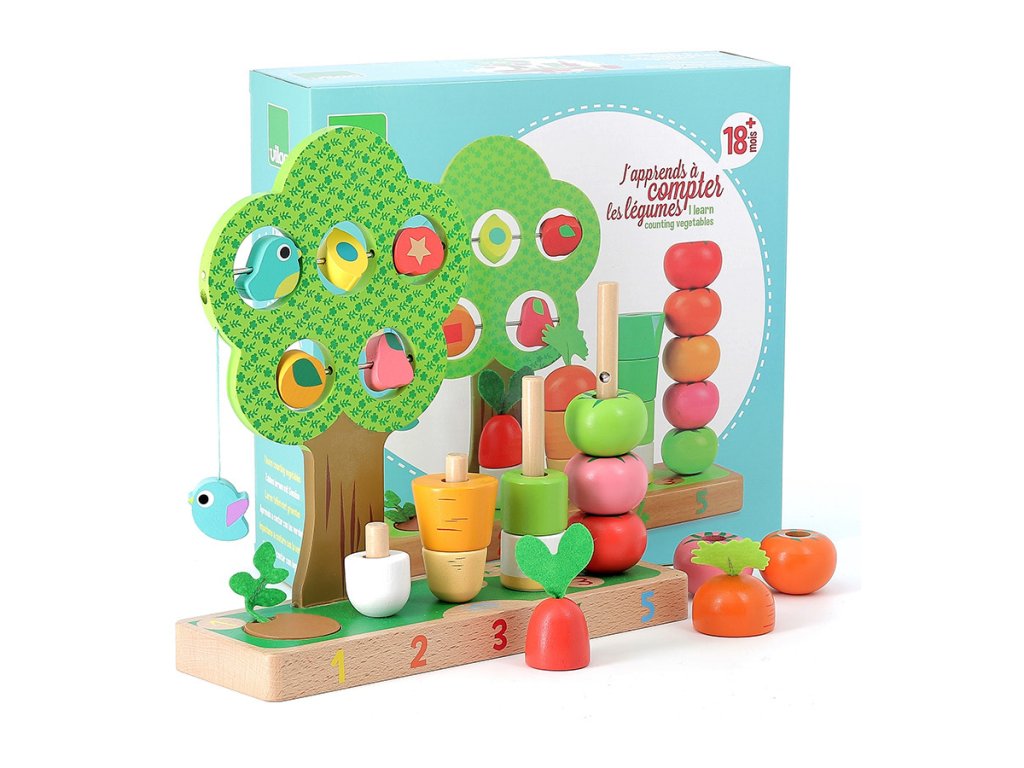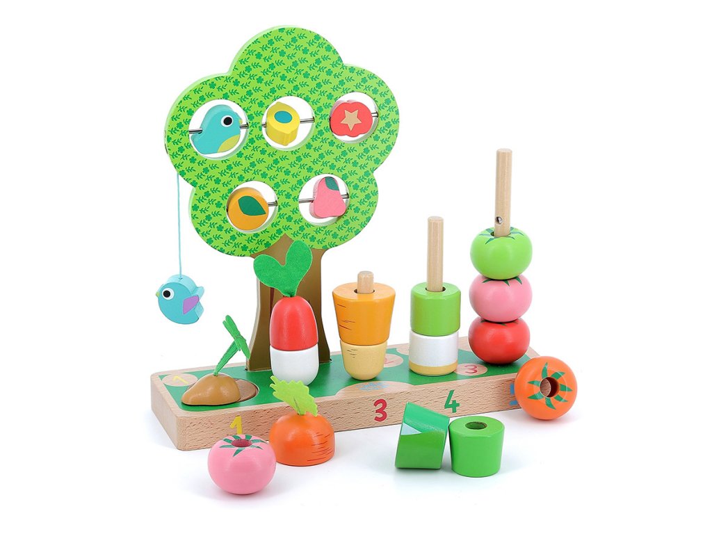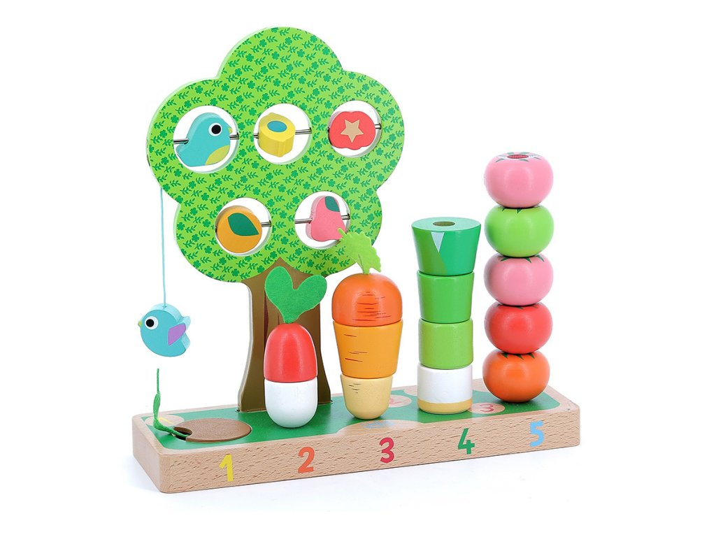 Hra, která probudí smysly dětí je ideální k učení počítání a rozeznávání tvarů. Tato dřevěná hračka se skládá ze základní desky, zeleniny a stromu s otočnými dílky. Zelenina obsahuje například mrkev, pórek a rajčata. Zeleninu a její dílky děti navlékají na dřevěné tyče. Nejvyšší z tyčí je upevněna na provázku, v případě pádu dítěte na ní, se tyč odkloní. Hračka je certifikovaná pro věk 1,5+. Hlavní vlastnosti: bezpečná a zábavná hračkarozvíjí logické myšlení a motoriku dítěte krásný design, jemné barvy upoutají pozornost dítěteDoplňkové parametry