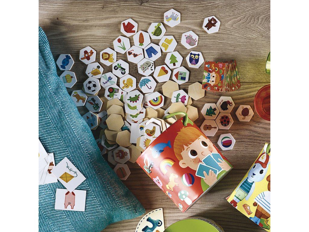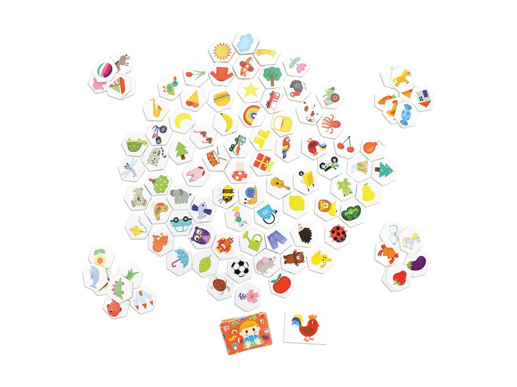 Prověřte postřeh Vašich dětí! Kdo mezi rozloženými dílky dokáže jako první najít obrázek shodný s vyobrazením na kartičce? Hráči přitom musí dát bedlivý pozor, v záplavě obrázků se totiž ukrývají i chytáky! Herní dílky jsou pevné a odolné, vyrobené ze dřeva. Dodáváno v praktickém a atraktivně dekorovaném kbelíku s dřevěným víkem. Hlavní vlastnosti: pro 2–5 hráčů100 herních dílků a 100 kartičekpraktické balení Zkrácený návod hry:Rozložte všechny herní dílky do středu stolu, obrázkem nahoru. Hráč si vezme kartu z balíčku, ukáže ji všem protihráčům. Hráč, který najde obrázek na stole jako první, si tuto kartu ponechá. Vítězí hráč, který jako první nasbírá 10 karet.Doplňkové parametry