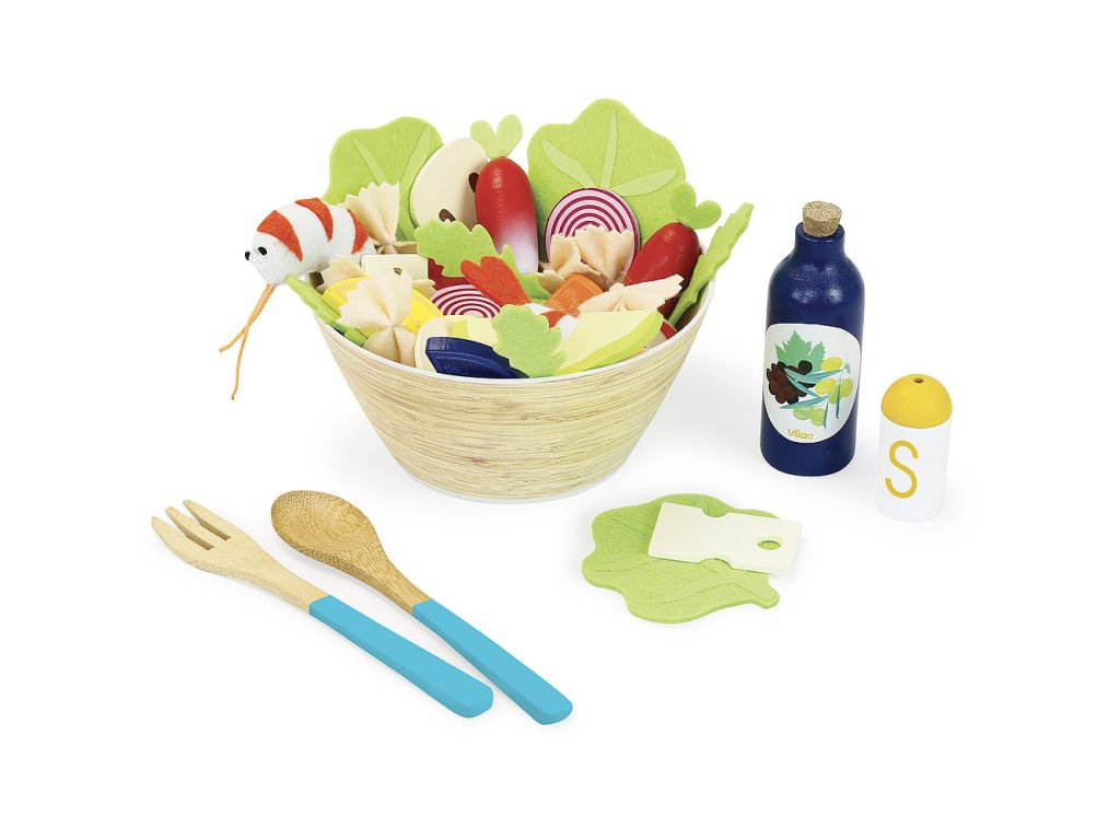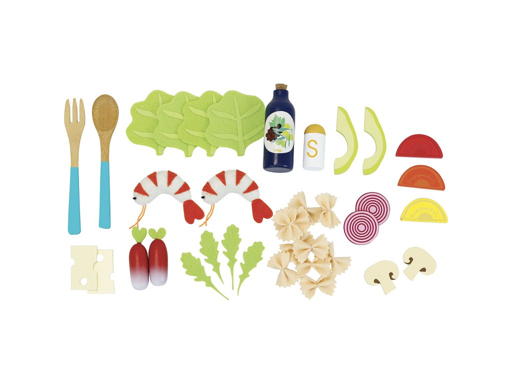 S touto sadou si děti mohou namíchat svůj vlastní salát přímo u sebe v pokoji. Najdete v něm 40 dřevěných a plstěných dílků: 1 velkou bambusovou mísu, 2 ks salátového příboru, 1 láhev kyselé zálivky, 1 solničku, 2 plátky hub, 2 plátky avokáda, 4 plátky rajčete, 2 ředkvičky, 2 cibule, 11 těstovin farfalle, 2 krevety, 4 listy rukoly, 4 listy hlávkového salátu a 2 plátky sýra. Vhodné od 3 let. Hlavní vlastnosti: vhodné do každé kuchyňkypotraviny vyrobené ze dřevaobsahuje 40 ksDoplňkové parametry