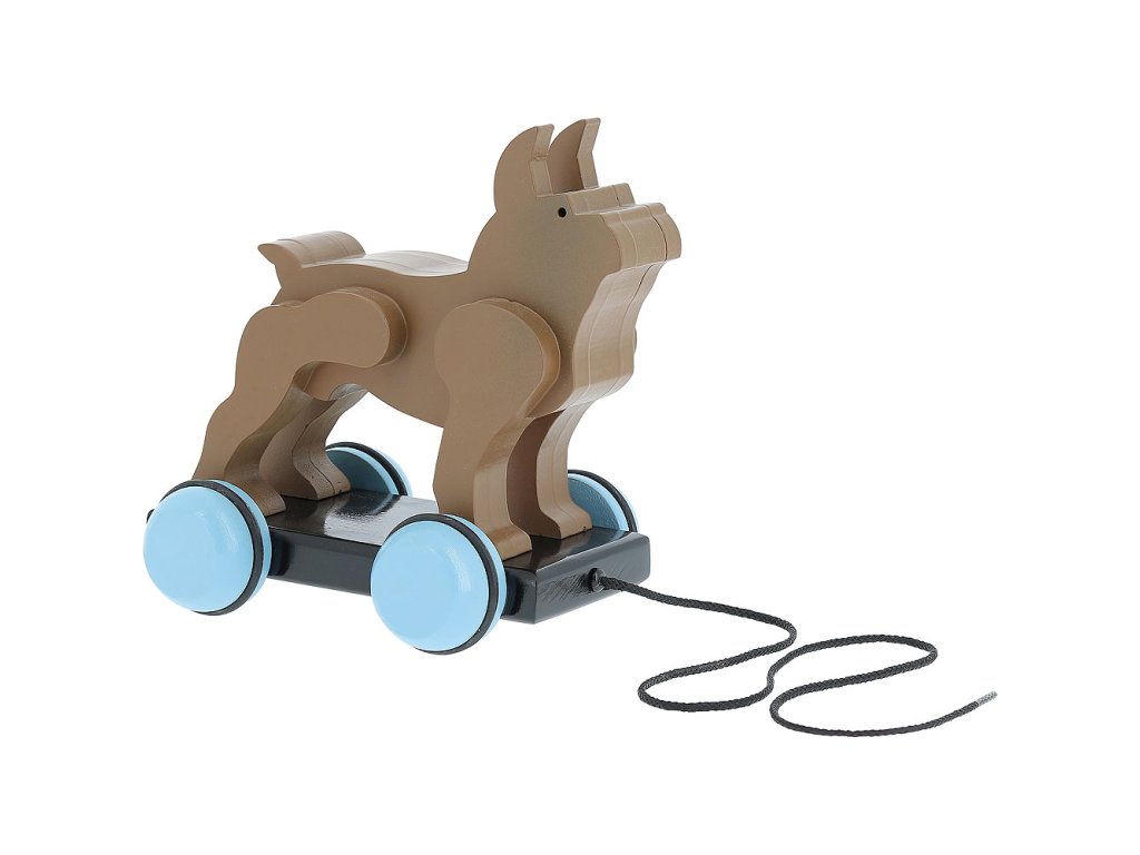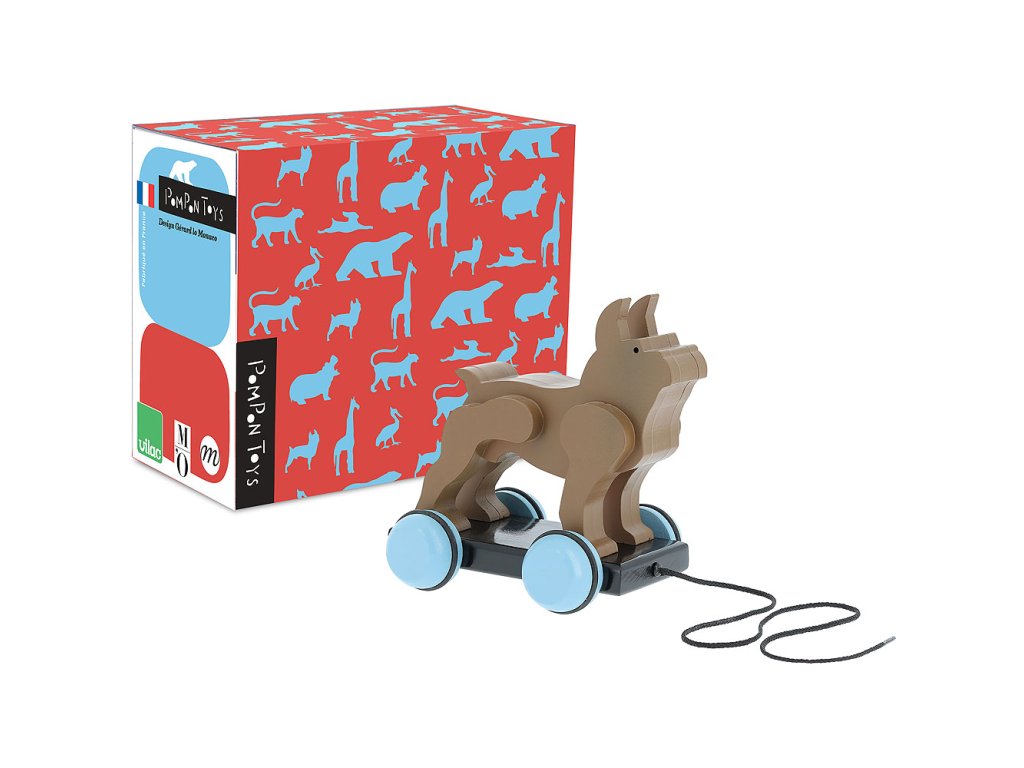 Dřevěný tahací pes v designu Francoise Pompona. Hlavní vlastnosti: design Francois Pomponrozvíjí koordinaci pohybů dětí Se svým malým přenosným pracovním stolem se sochař François Pompon (1855–1933) rád procházel po pařížském Jardin des Plantes (veřejný park a botanická zahrada). Tam mohl pozorovat zvířata a vyrábět jejich modely v malém měřítku. Zpět ve svém ateliéru vyřezával medvědy, pantery, ale také psy, kuřata a králíky, zjednodušováním tvarů nacházel podstatu každého zvířete. Před očima návštěvníků Muzea Orsay, kde je uloženo velké množství těchto soch, tak zvířata ožívají! Jeho sochy reinterpretoval umělec Gérard Lo Monaco a ve spolupráci s RMN (sdružení 34 muzeí) a Muzeem Orsay vzdává poctu Pomponovi výrobou této nádherné řady dřevěných hraček.Doplňkové parametry
