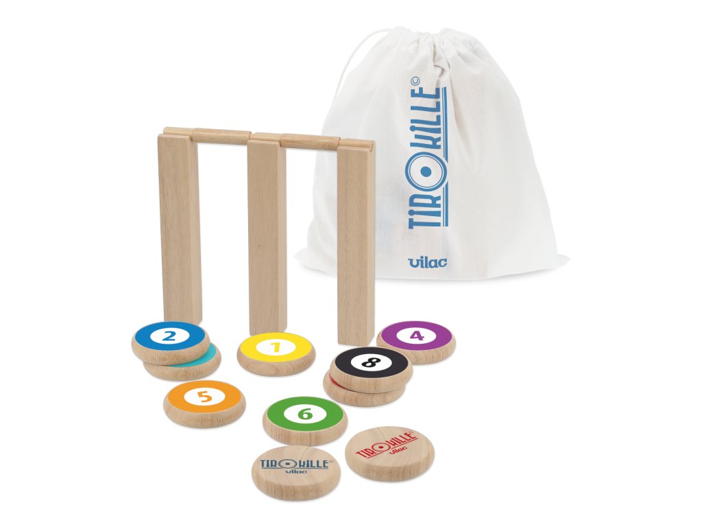 Hledáte novou zábavu na svou malou párty? Jedinečný mix kuželkových, pétanque a shuffleboard her je výzvou pro Vaši zručnost a strategické myšlení. Hra vyniká variabilitou a lze ji hrát podle několika různých pravidel. Budete se pokoušet překážku srazit, přiblížit se k ní co nejtěsněji, nebo jí projet? Vyzkoušejte a rozehrajte postupně všechny možnosti! Odolné provedení z masivního dřeva zajistí dlouhou životnost. Součástí balení je praktický bavlněný sáček pro snadný úklid a přenášení. Hlavní vlastnosti: 8 číslovaných puků, 2 speciální puky a 4 dílná překážkapro 2–8 hráčů4 herní variantyrobustní a odolné provedení z masivního dřevapraktické balení Zkrácený návod hry:Hráči se rozdělí do 2 týmů. Při hře stojí asi 3 m od branky, která se skládá ze 2 nebo 3 dřevěných tyček a 1 nebo 2 příčně vyřezávaných dřívek. Při hodu mají nohu položenou na puku „Tirokille“. V plném návodu najdete pravidla pro 4 verze hry, mírně se liší, avšak cílem je většinou prohodit puky brankou. Boduje se většinou podle bodového ohodnocení daného puku a blízkosti nebo úspěšnosti hodu.Doplňkové parametry