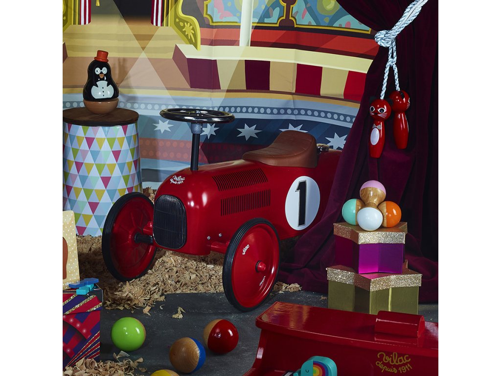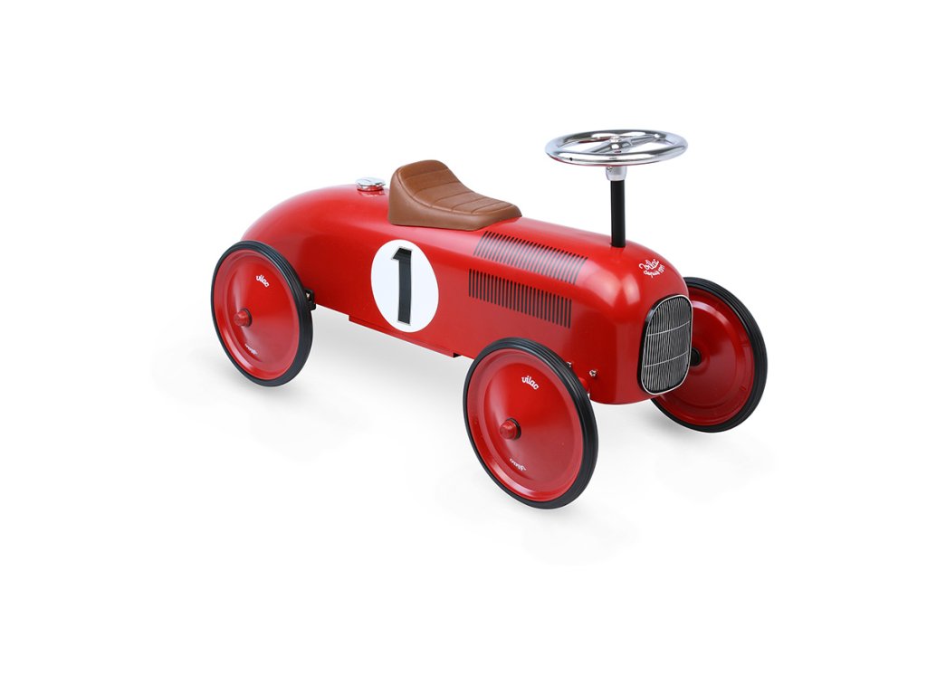 Odrážedlo Vintage ve stylu závodního auta je plně kovové a má červenou metalickou barvu. Volant ovládá zatáčení předních kol. Hnědé sedadlo je vyrobeno z plastu. Kola odrážedla jsou pogumovaná a zaručují tak tichý chod i na pevném povrchu. Hlavní vlastnosti: stabilní kovové odrážedlo s pogumovanými kolystylový originální designnosnost 20 kgDoplňkové parametry