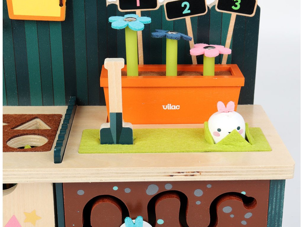 Přiveďte své dítě zpět k přírodě se zahradní multi-aktivitní hračkou, inspirovanou venkovským životem. Zahrádka je nejenom dekorativní, ale také nabízí mnoho aktivit pro Vaše dítě, přičemž mu umožňuje "dělat věci jako dospělí". S květinami k zasazení, zeleninou k sklizni, včelou, která cestuje po kovovém drátě, Vaše dítě během hraní zažije spoustu zábavy. Když použije lopatku, králíček vyleze ze svého doupěte. Zahradní multi-aktivitní hračka perfektně zapadá do naší řady hraček inspirovaných přírodou, jako je zahrada nebo zelinářství. Ideální hra pro malé zahradníky. Obsahuje: 3 květiny k zasazení,1 dřevěná lopatka,1 dřevěná konev,4 barevné dřevěné zeleniny. Multifunkční zahrádka poskytuje dětem bohaté smyslové podněty, což podporuje rozvoj jejich hmatu, zraku a sluchu. Ideální hračka pro metodu Montessori. Jsou to speciálně navržené hračky, které vycházejí z pedagogické metody vyvinuté italskou lékařkou a pedagožkou Marií Montessori. Tyto hračky jsou navrženy tak, aby podporovaly přirozený vývoj dítěte a umožňovaly jim objevovat svět okolo sebe pomocí vlastního zájmu a aktivity. Montessori pedagogika klade také důraz na respekt k individuálnímu rytmu každého dítěte. Rozvíjí také psychomotorické dovednosti a podněcuje dětskou fantazii. Díky němu si dítě může hrát a učit se mnoho hodin. Přírodní dřevo použité při výrobě zajišťuje bezpečnost a krásný nadčasový vzhled, perfektní doplněk při zařizování dětského pokoje. Při hře se děti učí sdílet, spolupracovat a komunikovat. To podporuje rozvoj sociálních dovedností a přípravu na interakce s vrstevníky. Hlavní vlastnosti: podporuje rozvoj jemné motoriky a koordinace ruky a okapodněcuje kreativní myšlení a vývoj představivostiideální hračka pro metodu Montessorihra pro malé zahradníkysenzorická stimulaceedukace skrze hruDoplňkové parametry