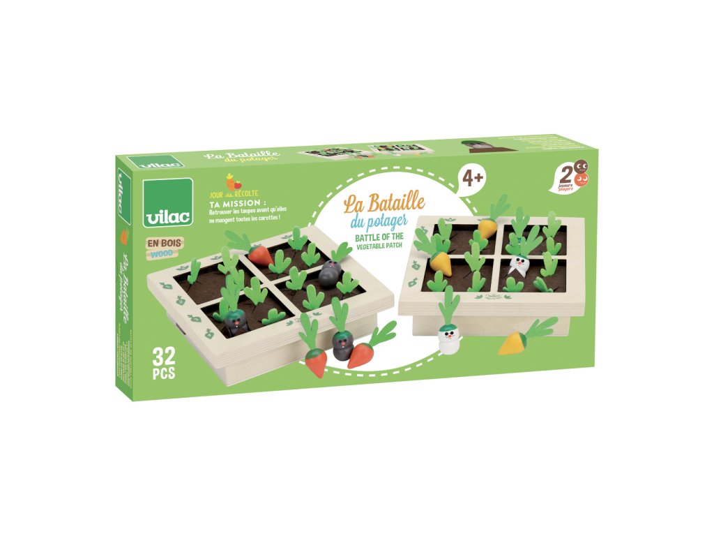 Mírně poškozený obal. Nové zboží bez závad. Budete první kdo odhalí všechny krtčí záškodníky? Originální hru můžete v jednodušší z variací hrát s menšími dětmi, nebo jako obdobu strategické hry Lodě v kolektivu starších dětí. Součásti hry kombinují silnou překližku, masivní dřevo či plsť a jsou poutavě, tématicky dekorované. Hlavní vlastnosti:pro 2 hráče2 hrací plochy, 2×12 červených mrkví a 2×4 krtci2 herní varianty, vhodné i pro menší dětijedinečné a atraktivní zpracování Dokumentace:Návod ke hře Zeleninová bitva (CZ)Návod ke hře Zeleninová bitva (SK)Návod ke hře Zeleninová bitva (FR, EN, DE, ES, IT, NL, PT, SE, DK) Výrobce Vilac se může pyšnit úzkou spoluprací s francouzskou agenturou ADEME. Takto označené hračky jsou vyráběny s ohledy k životnímu prostředí, ekologicky, udržitelně a s využitím obnovitelných zdrojů.Doplňkové parametry